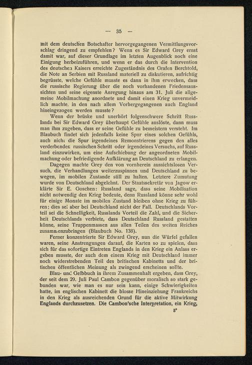 Wenn der brüske und unerhört folgenschwere Schritt Russ-lands bei Sir Edward Grey überhaupt Gefühle auslöste, dann mussman ihm zugeben, dass er seine Gefühle zu bemeistern versteht. ImBlaubuch findet sich jedenfalls keine Spur eines solchen Gefühls,auch niche die Spur irgendeines Remonstrierens gegen den allesverderbenden russischen Schritt oder irgendeines Versuchs, auf Russ-land einzuwirken, um eine Aufschiebung der angeordneten Mobil-machung oder befriedigende Aufklärung an Deutschland zu erlangen.