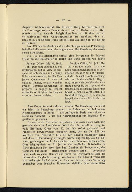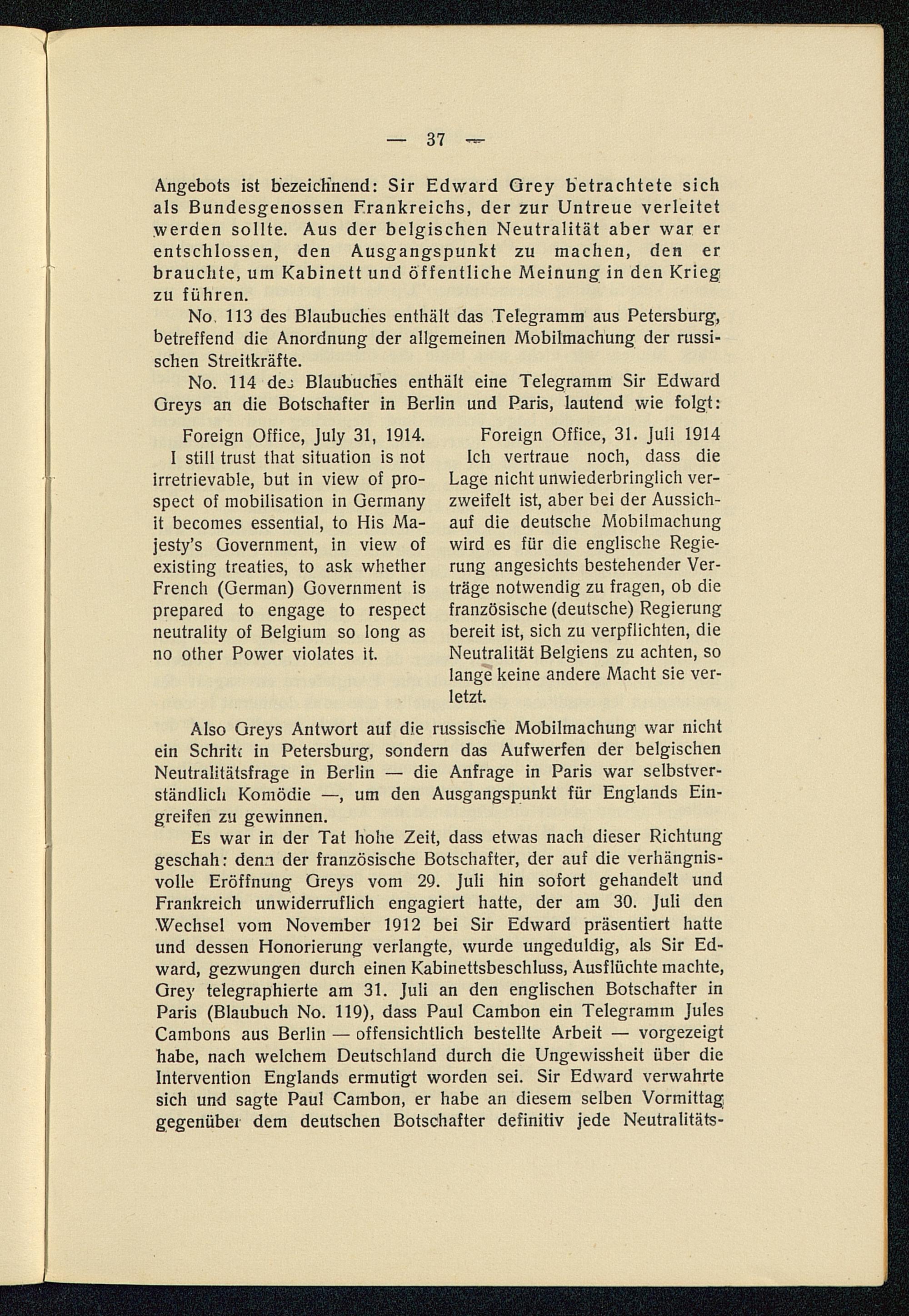 Foreign Office, 31. Juli 1914Ich vertraue noch, dass dieLage nicht unwiederbringlich ver-zweifelt ist, aber bei der Aussich-auf die deutsche Mobilmachungwird es für die englische Regie-rung angesichts bestehender Ver-träge notwendig zu fragen, ob diefranzösische (deutsche) Regierungbereit ist, sich zu verpflichten, dieNeutralität Belgiens zu achten, solange keine andere Macht sie ver-letzt.