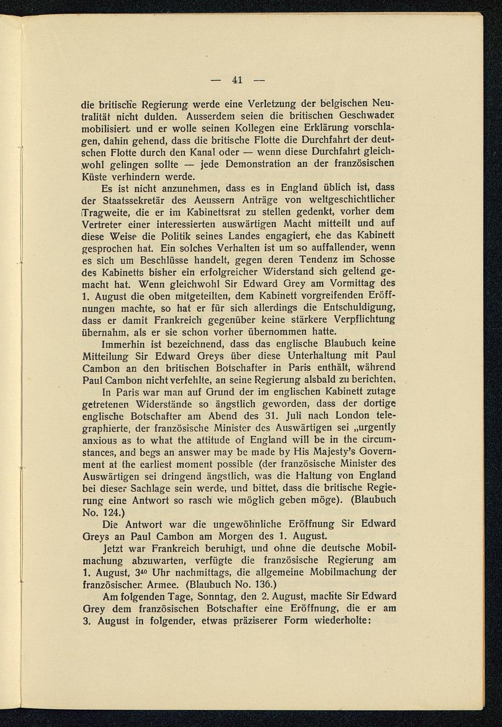 Immerhin ist bezeichnend, dass das englische Blaubuch keineMitteilung Sir Edward Greys über diese Unterhaltung mit PaulCambon an den britischen Botschafter in Paris enthält, währendPaul Cambon nicht verfehlte, an seine Regierung alsbald zu berichten,