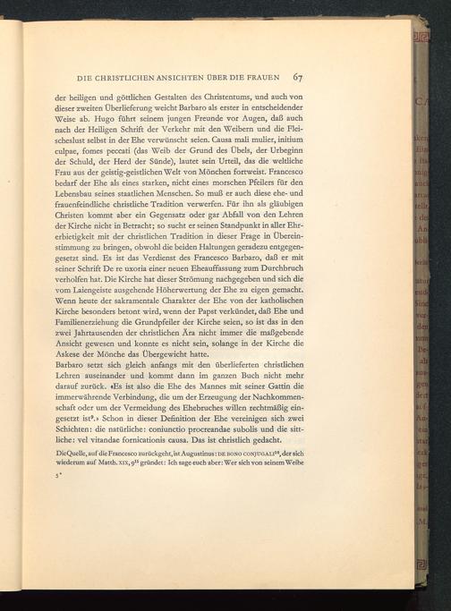 Barbaro setzt sich gleich anfangs mit den überlieferten christlichenLehren auseinander und kommt dann im ganzen Buch nicht mehrdarauf zurück. «Es ist also die Ehe des Mannes mit seiner Gattin dieimmerwährende Verbindung, die um der Erzeugung der Nachkommen-schaft oder um der Vermeidung des Ehebruches willen rechtmäßig ein-gesetzt ist 9 .» Schon in dieser Definition der Ehe vereinigen sich zweiSchichten: die natürliche: coniunctio procreandae subolis und die sitt-liche : vel vitandae fornicationis causa. Das ist christlich gedacht.