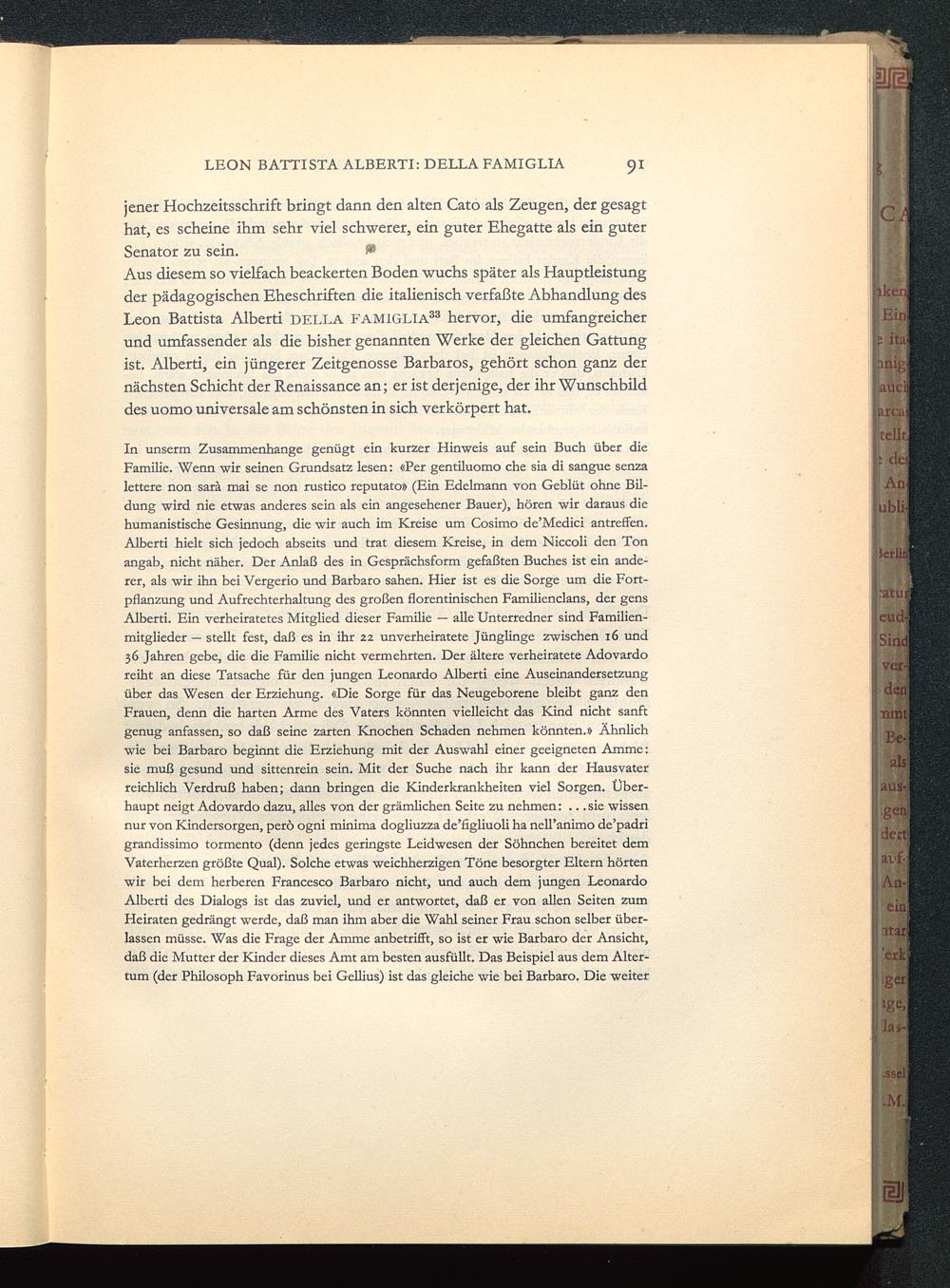 Aus diesem so vielfach beackerten Boden wuchs später als Haupdeistungder pädagogischen Eheschriften die italienisch verfaßte Abhandlung desLeon Battista Alberti DF.LLA FAMIGLIA 33 hervor, die umfangreicherund umfassender als die bisher genannten Werke der gleichen Gattungist. Alberti, ein jüngerer Zeitgenosse Barbaros, gehört schon ganz dernächsten Schicht der Renaissance an; er ist derjenige, der ihr Wunschbilddes uomo universale am schönsten in sich verkörpert hat.