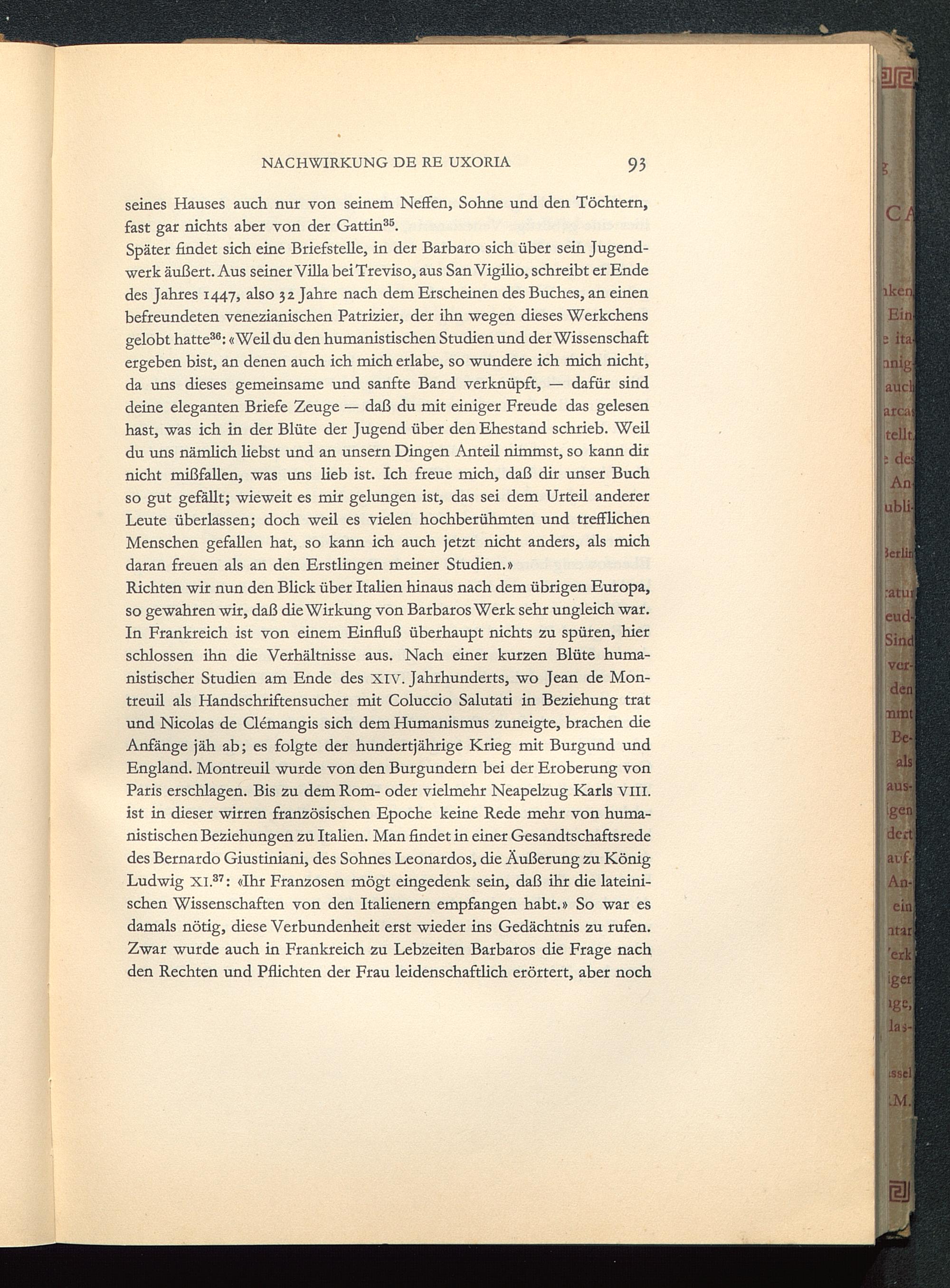 Später findet sich eine Briefstelle, in der Barbaro sich über sein Jugend-werk äußert. Aus seiner Villa bei Treviso , aus San Vigilio, schreibt er Endedes Jahres 1447, also 32 Jahre nach dem Erscheinen des Buches, an einenbefreundeten venezianischen Patrizier, der ihn wegen dieses Werkchensgelobt hatte 36 : «Weil du den humanistischen Studien und der Wissenschaftergeben bist, an denen auch ich mich erlabe, so wundere ich mich nicht,da uns dieses gemeinsame und sanfte Band verknüpft, — dafür sinddeine eleganten Briefe Zeuge — daß du mit einiger Freude das gelesenhast, was ich in der Blüte der Jugend über den Ehestand schrieb. Weildu uns nämlich Hebst und an unsern Dingen Anteil nimmst, so kann dirnicht mißfallen, was uns Heb ist. Ich freue mich, daß dir unser Buchso gut gefällt; wieweit es mir gelungen ist, das sei dem Urteil andererLeute überlassen; doch weil es vielen hochberühmten und trefflichenMenschen gefallen hat, so kann ich auch jetzt nicht anders, als michdaran freuen als an den Erstlingen meiner Studien.»Richten wir nun den Blick über Italien hinaus nach dem übrigen Europa ,so gewahren wir, daß die Wirkung von Barbaros Werk sehr ungleich war.In Frankreich ist von einem Einfluß überhaupt nichts zu spüren, hierschlössen ihn die Verhältnisse aus. Nach einer kurzen Blüte huma-nistischer Studien am Ende des XIV. Jahrhunderts, wo Jean de Mon-treuil als Handschriftensucher mit Coluccio Salutati in Beziehung tratund Nicolas de Clemangis sich dem Humanismus zuneigte, brachen dieAnfänge jäh ab; es folgte der hundertjährige Krieg mit Burgund undEngland. Montreuil wurde von den Burgundern bei der Eroberung vonParis erschlagen. Bis zu dem Rom- oder vielmehr Neapelzug Karls VIII .ist in dieser wirren französischen Epoche keine Rede mehr von huma-nistischen Beziehungen zu Italien . Man findet in einer Gesandtschaftsrededes Bernardo Giustiniani, des Sohnes Leonardos, die Äußerung zu KönigLudwig XI. 37 : «Ihr Franzosen mögt eingedenk sein, daß ihr die lateini-schen Wissenschaften von den Italienern empfangen habt.» So war esdamals nötig, diese Verbundenheit erst wieder ins Gedächtnis zu rufen.Zwar wurde auch in Frankreich zu Lebzeiten Barbaros die Frage nachden Rechten und Pflichten der Frau leidenschaftlich erörtert, aber noch