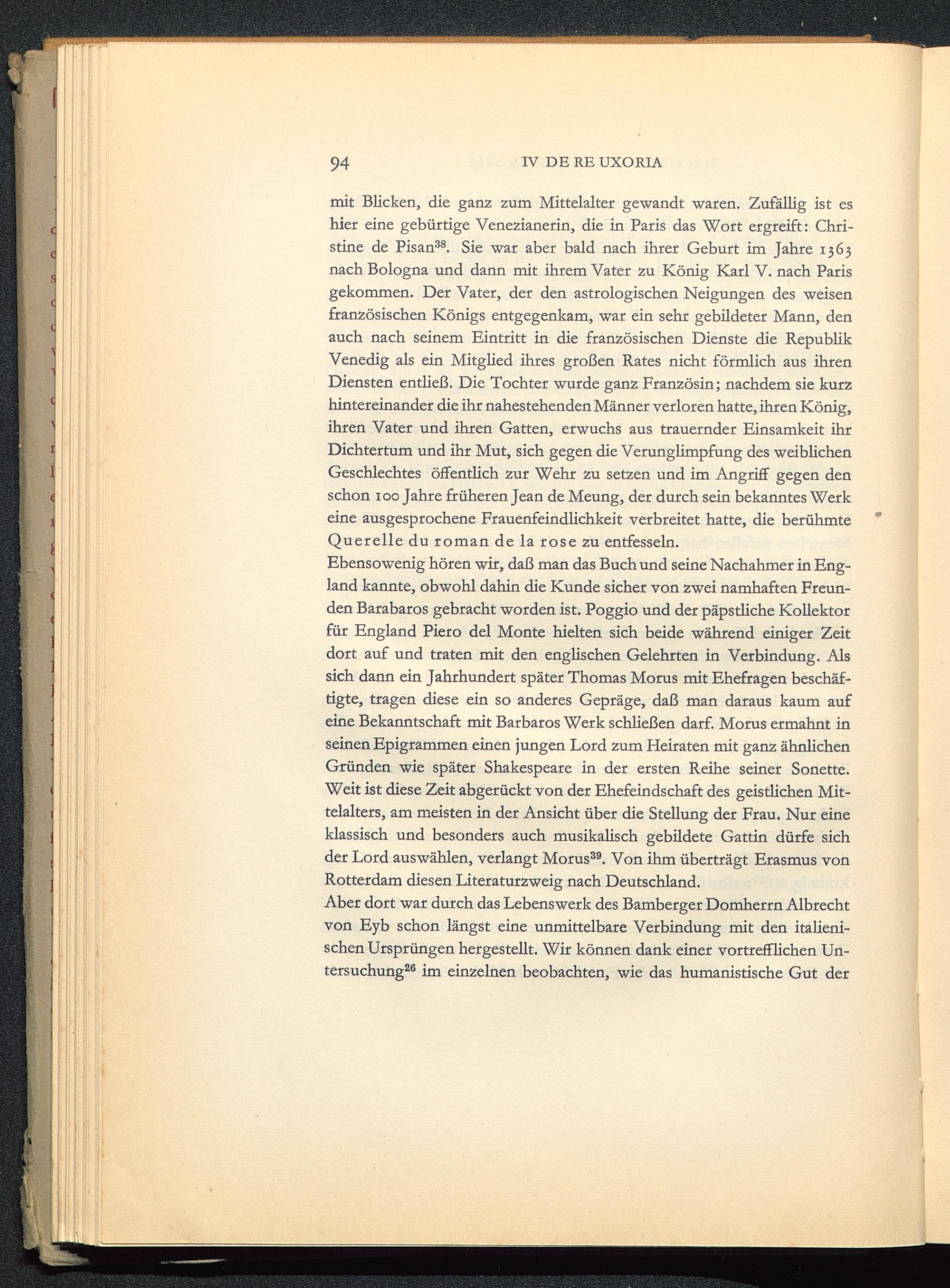 Ebensowenig hören wir, daß man das Buch und seine Nachahmer in Eng-land kannte, obwohl dahin die Kunde sicher von zwei namhaften Freun-den Barabaros gebracht worden ist. Poggio und der päpstliche Kollektorfür England Piero del Monte hielten sich beide während einiger Zeitdort auf und traten mit den englischen Gelehrten in Verbindung. Alssich dann ein Jahrhundert später Thomas Morus mit Ehefragen beschäf-tigte, tragen diese ein so anderes Gepräge, daß man daraus kaum aufeine Bekanntschaft mit Barbaros Werk schließen darf. Morus ermahnt inseinen Epigrammen einen jungen Lord zum Heiraten mit ganz ähnlichenGründen wie später Shakespeare in der ersten Reihe seiner Sonette.Weit ist diese Zeit abgerückt von der Ehefeindschaft des geistlichen Mit-telalters, am meisten in der Ansicht über die Stellung der Frau. Nur eineklassisch und besonders auch musikalisch gebildete Gattin dürfe sichder Lord auswählen, verlangt Morus 39 . Von ihm überträgt Erasmus vonRotterdam diesen Literaturzweig nach Deutschland .Aber dort war durch das Lebenswerk des Bamberger Domherrn Albrechtvon Eyb schon längst eine unmittelbare Verbindung mit den italieni-schen Ursprüngen hergestellt. Wir können dank einer vortrefflichen Un-tersuchung 26 im einzelnen beobachten, wie das humanistische Gut der