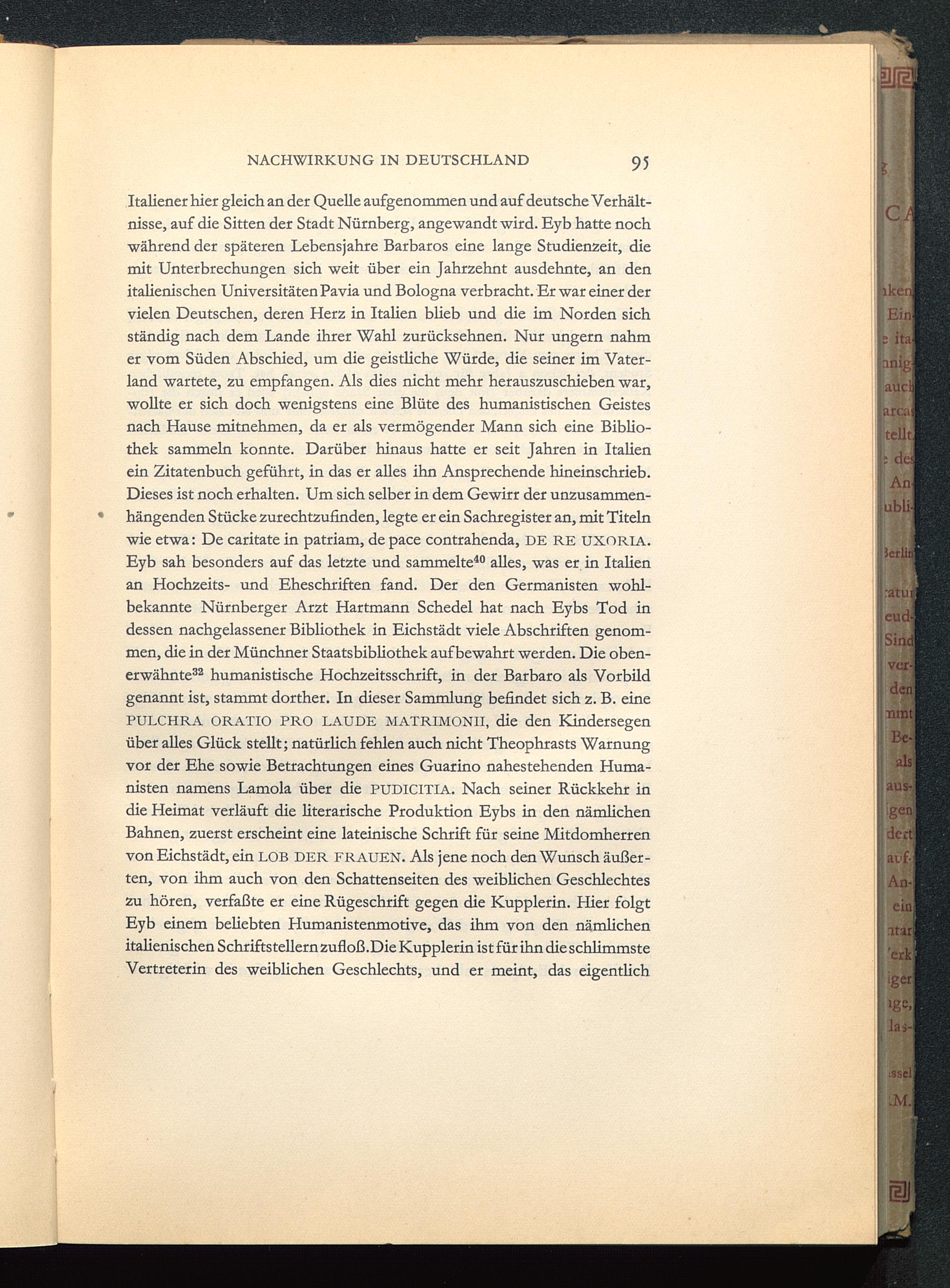 Italiener hier gleich an der Quelle aufgenommen und auf deutsche Verhält-nisse, auf die Sitten der Stadt Nürnberg , angewandt wird. Eyb hatte nochwährend der späteren Lebensjahre Barbaros eine lange Studienzeit, diemit Unterbrechungen sich weit über ein Jahrzehnt ausdehnte, an denitalienischen Universitäten Pavia und Bologna verbracht. Er war einer dervielen Deutschen, deren Herz in Italien büeb und die im Norden sichständig nach dem Lande ihrer Wahl zurücksehnen. Nur ungern nahmer vom Süden Abschied, um die geistliche Würde, die seiner im Vater-land wartete, zu empfangen. Als dies nicht mehr herauszuschieben war,wollte er sich doch wenigstens eine Blüte des humanistischen Geistesnach Hause mitnehmen, da er als vermögender Mann sich eine Biblio-thek sammeln konnte. Darüber hinaus hatte er seit Jahren in Italien ein Zitatenbuch geführt, in das er alles ihn Ansprechende hineinschrieb.Dieses ist noch erhalten. Um sich selber in dem Gewirr der unzusammen-hängenden Stücke zurechtzufinden, legte er ein Sachregister an, mit Titelnwie etwa: De caritate in patriam, depace contrahenda, DE RE UXORIA.Eyb sah besonders auf das letzte und sammelte 40 alles, was er in Italien an Hochzeits- und Eheschriften fand. Der den Germanisten wohl-bekannte Nürnberger Arzt Hartmann Schedel hat nach Eybs Tod indessen nachgelassener Bibliothek in Eichstädt viele Abschriften genom-men, die in der Münchner Staatsbibliothek aufbewahrt werden. Die oben-erwähnte 32 humanistische Hochzeitsschrift, in der Barbaro als Vorbildgenannt ist, stammt dorther. In dieser Sammlung befindet sich z. B. einePULCHRA ORATIO PRO LAUDE MATRIMONII, die den Kindersegenüber alles Glück stellt; natürlich fehlen auch nicht Theophrasts Warnungvor der Ehe sowie Betrachtungen eines Guarino nahestehenden Huma-nisten namens Lamola über die PUDICITIA. Nach seiner Rückkehr indie Heimat verläuft die literarische Produktion Eybs in den nämlichenBahnen, zuerst erscheint eine lateinische Schrift für seine Mitdomherrenvon Eichstädt, ein LOB DER FRAUEN. Als jene noch den Wunsch äußer-ten, von ihm auch von den Schattenseiten des weibüchen Geschlechteszu hören, verfaßte er eine Rügeschrift gegen die Kupplerin. Hier folgtEyb einem beliebten Humanistenmotive, das ihm von den nämlichenitalienischen Schriftstellern zufloß.Die Kupplerin ist für ihn die schlimmsteVertreterin des weiblichen Geschlechts, und er meint, das eigentlich