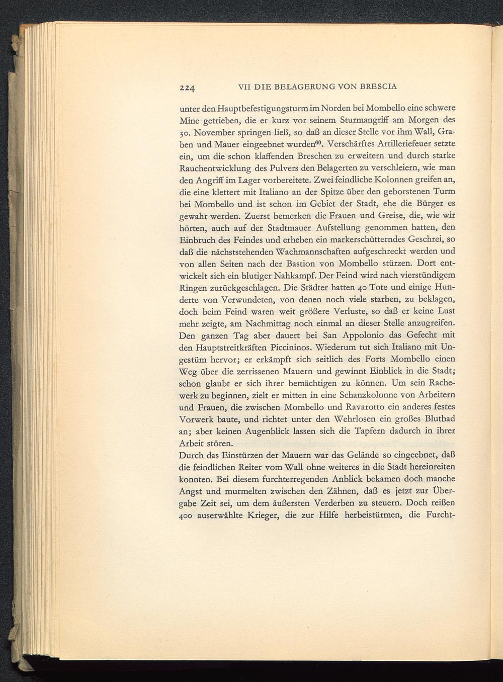 unter den Hauptbefestigungsturm im Norden bei Mombello eine schwereMine getrieben, die er kurz vor seinem Sturmangriff am Morgen des30. November springen ließ, so daß an dieser Stelle vor ihm Wall, Gra-ben und Mauer eingeebnet wurden 60 . Verschärftes Artilleriefeuer setzteein, um die schon klaffenden Breschen zu erweitern und durch starkeRauchentwicklung des Pulvers den Belagerten zu verschleiern, wie manden Angriff im Lager vorbereitete. Zwei feindliche Kolonnen greifen an,die eine klettert mit Italiano an der Spitze über den geborstenen Turmbei Mombello und ist schon im Gebiet der Stadt, ehe die Bürger esgewahr werden. Zuerst bemerken die Frauen und Greise, die, wie wirhörten, auch auf der Stadtmauer Aufstellung genommen hatten, denEinbruch des Feindes und erheben ein markerschütterndes Geschrei, sodaß die nächststehenden Wachmannschaften aufgeschreckt werden undvon allen Seiten nach der Bastion von Mombello stürzen. Dort ent-wickelt sich ein blutiger Nahkampf. Der Feind wird nach vierstündigemRingen zurückgeschlagen. Die Städter hatten 40 Tote und einige Hun-derte von Verwundeten, von denen noch viele starben, zu beklagen,doch beim Feind waren weit größere Verluste, so daß er keine Lustmehr zeigte, am Nachmittag noch einmal an dieser Stelle anzugreifen.Den ganzen Tag aber dauert bei San Appolonio das Gefecht mitden Hauptstreitkräften Piccininos. Wiederum tut sich Italiano mit Un-gestüm hervor; er erkämpft sich seitlich des Forts Mombello einenWeg über die zerrissenen Mauern und gewinnt Einblick in die Stadt;schon glaubt er sich ihrer bemächtigen zu können. Um sein Rache-werk zu beginnen, zielt er mitten in eine Schanzkolonne von Arbeiternund Frauen, die zwischen Mombello und Ravarotto ein anderes festesVorwerk baute, und richtet unter den Wehrlosen ein großes Blutbadan; aber keinen Augenblick lassen sich die Tapfern dadurch in ihrerArbeit stören.
