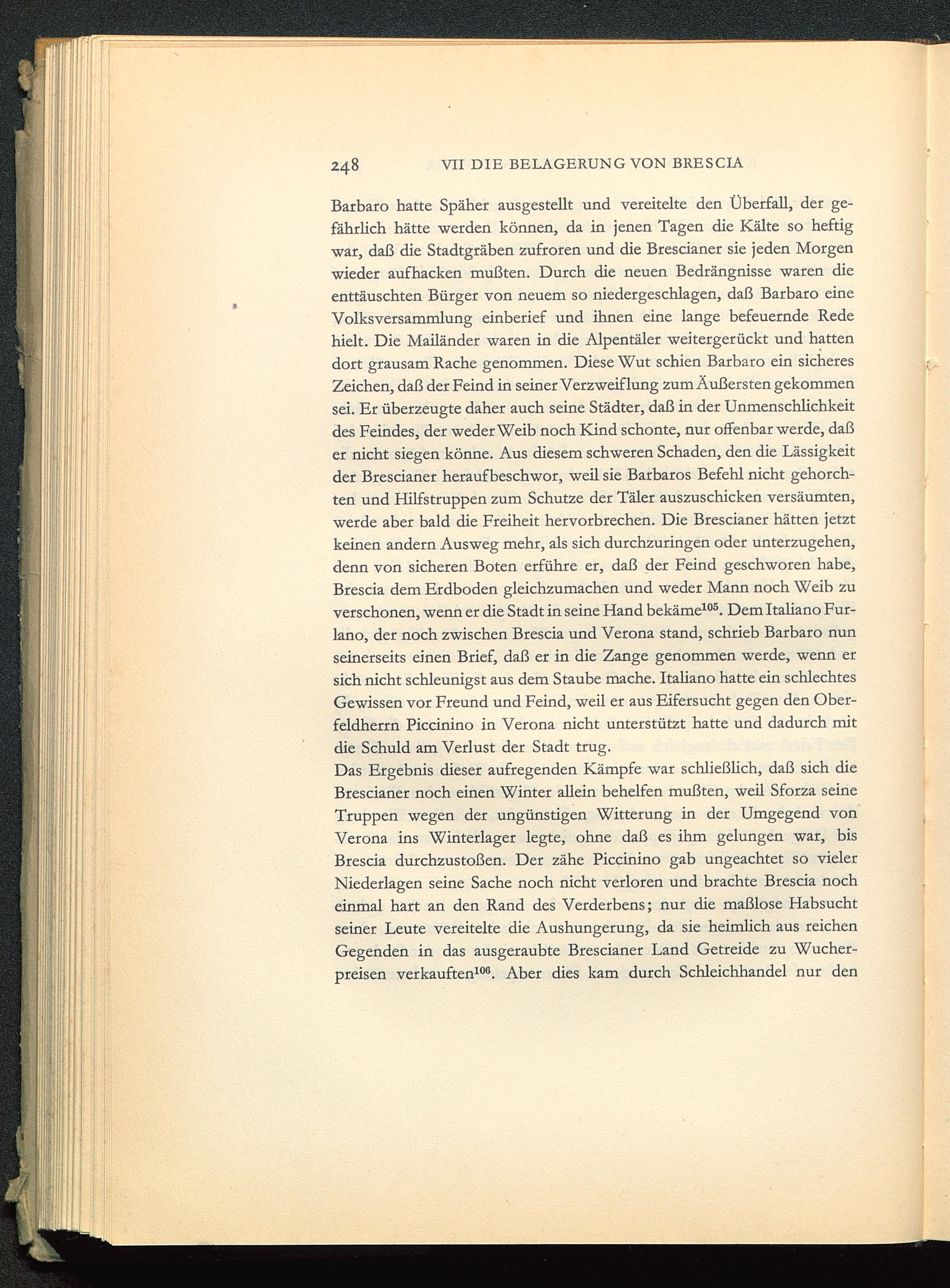 Das Ergebnis dieser aufregenden Kämpfe war schließlich, daß sich dieBrescianer noch einen Winter allein behelfen mußten, weil Sforza seineTruppen wegen der ungünstigen Witterung in der Umgegend vonVerona ins Winterlager legte, ohne daß es ihm gelungen war, bisBrescia durchzustoßen. Der zähe Piccinino gab ungeachtet so vielerNiederlagen seine Sache noch nicht verloren und brachte Brescia nocheinmal hart an den Rand des Verderbens; nur die maßlose Habsuchtseiner Leute vereitelte die Aushungerung, da sie heimlich aus reichenGegenden in das ausgeraubte Brescianer Land Getreide zu Wucher-preisen verkauften 106 . Aber dies kam durch Schleichhandel nur den