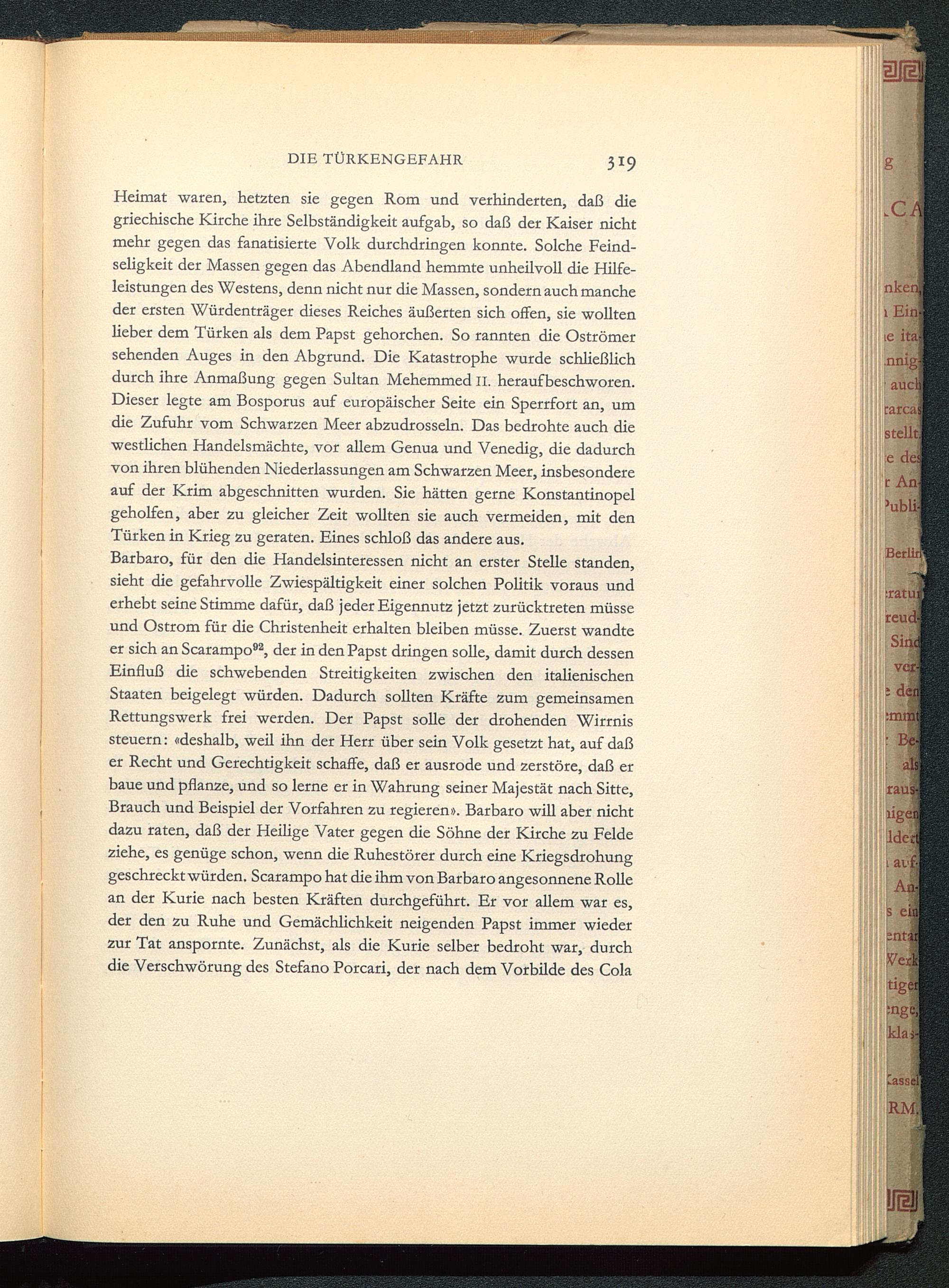 Heimat waren, hetzten sie gegen Rom und verhinderten, daß diegriechische Kirche ihre Selbständigkeit aufgab, so daß der Kaiser nichtmehr gegen das fanatisierte Volk durchdringen konnte. Solche Feind-seligkeit der Massen gegen das Abendland hemmte unheilvoll die Hilfe-leistungen des Westens, denn nicht nur die Massen, sondern auch mancheder ersten Würdenträger dieses Reiches äußerten sich offen, sie wolltenlieber dem Türken als dem Papst gehorchen. So rannten die Oströmersehenden Auges in den Abgrund. Die Katastrophe wurde schließlichdurch ihre Anmaßung gegen Sultan Mehemmed II. heraufbeschworen.Dieser legte am Bosporus auf europäischer Seite ein Sperrfort an, umdie Zufuhr vom Schwarzen Meer abzudrosseln. Das bedrohte auch diewestlichen Handelsmächte, vor allem Genua und Venedig, die dadurchvon ihren blühenden Niederlassungen am Schwarzen Meer , insbesondereauf der Krim abgeschnitten wurden. Sie hätten gerne Konstantinopelgeholfen, aber zu gleicher Zeit wollten sie auch vermeiden, mit denTürken in Krieg zu geraten. Eines schloß das andere aus.Barbaro, für den die Handelsinteressen nicht an erster Stelle standen,sieht die gefahrvolle Zwiespältigkeit einer solchen Politik voraus underhebt seine Stimme dafür, daß jeder Eigennutz jetzt zurücktreten müsseund Ostrom für die Christenheit erhalten bleiben müsse. Zuerst wandteer sich an Scarampo 92 , der in den Papst dringen solle, damit durch dessenEinfluß die schwebenden Streitigkeiten zwischen den italienischenStaaten beigelegt würden. Dadurch sollten Kräfte zum gemeinsamenRettungswerk frei werden. Der Papst solle der drohenden Wirrnissteuern: «deshalb, weil ihn der Herr über sein Volk gesetzt hat, auf daßer Recht und Gerechtigkeit schaffe, daß er ausrode und zerstöre, daß erbaue und pflanze, und so lerne er in Wahrung seiner Majestät nach Sitte,Brauch und Beispiel der Vorfahren zu regieren». Barbaro will aber nichtdazu raten, daß der Heilige Vater gegen die Söhne der Kirche zu Feldeziehe, es genüge schon, wenn die Ruhestörer durch eine Kriegsdrohunggeschreckt würden. Scarampo hat die ihm von Barbaro angesonnene Rollean der Kurie nach besten Kräften durchgeführt. Er vor allem war es,der den zu Ruhe und Gemächlichkeit neigenden Papst immer wiederzur Tat anspornte. Zunächst, als die Kurie selber bedroht war, durchdie Verschwörung des Stefano Porcari , der nach dem Vorbilde des Cola