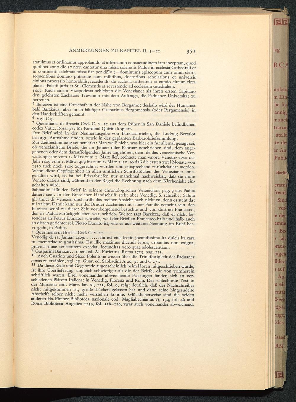Der Brief wird in der Neuherausgabe von Barzizzabriefen, die Ludwig Bertalot besorgt, Aufnahme finden, sowie in der geplanten Barbarobriefsammlung.Zur Zeitbestimmung sei bemerkt: Man weiß nicht, was hier ein für allemal gesagt sei,ob venezianische Briefe, die im Januar oder Februar geschrieben sind, dem ange-gebenen oder dem darauffolgenden Jahre angehören, denn da das venezianische Ver-waltungsjahr vom 1. März zum 1. März lief, rechnete man «more Veneto» etwa dasJahr 1409 vom 1. März 1409 bis zum 1. März 1410, so daß die ersten zwei Monate von1410 auch noch 1409 zugerechnet wurden und entsprechend zurückdatiert werden.Wenn diese Gepflogenheit in allen amtlichen Schriftstücken der Venezianer inne-gehalten wird, so ist bei Privatbriefen nur manchmal nachweisbar, daß sie moreVeneto datiert sind, während in der Regel die Rechnung nach dem Kirchenjahr ein-gehalten wird.