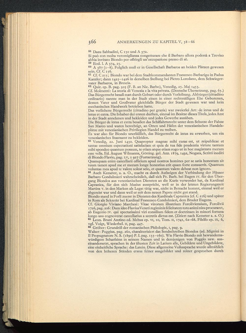 64 Auch Kemeter, a. a. O., macht es durch Aufzeigen der Verbindung der HäuserBarbaro Condulmieri wahrscheinlich, daß sich Fr. Barb. bei Eugen iv. für den Über-gang Biondos aus venezianischen Diensten an die Kurie verwendet hat, da KardinalCapranica, für den sich Masius ausspricht, weil er in der letzten RegierungszeitMartins v. in den Marken als Legat tätig war, nicht in Betracht kommt, einmal weil erabgereist war und dann weil er mit dem neuen Papste nicht gut stand.