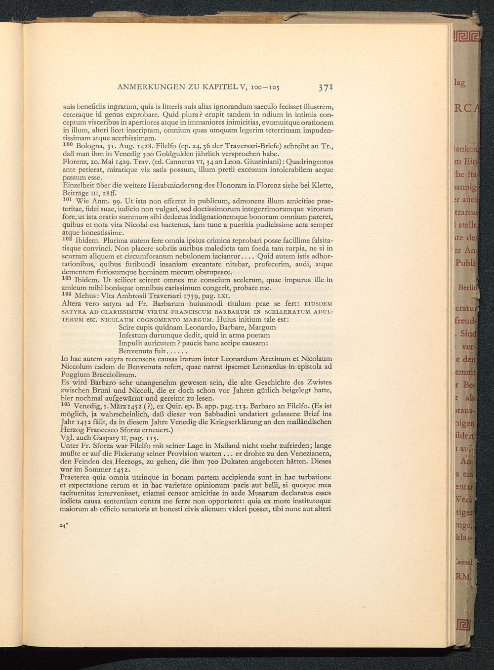 100 Bologna, 31. Aug. 1428. Filelfo (ep. 24, 36 der Traversari-Briefe) schreibt an Tr.,daß man ihm in Venedig 500 Goldgulden jährlich versprochen habe.
