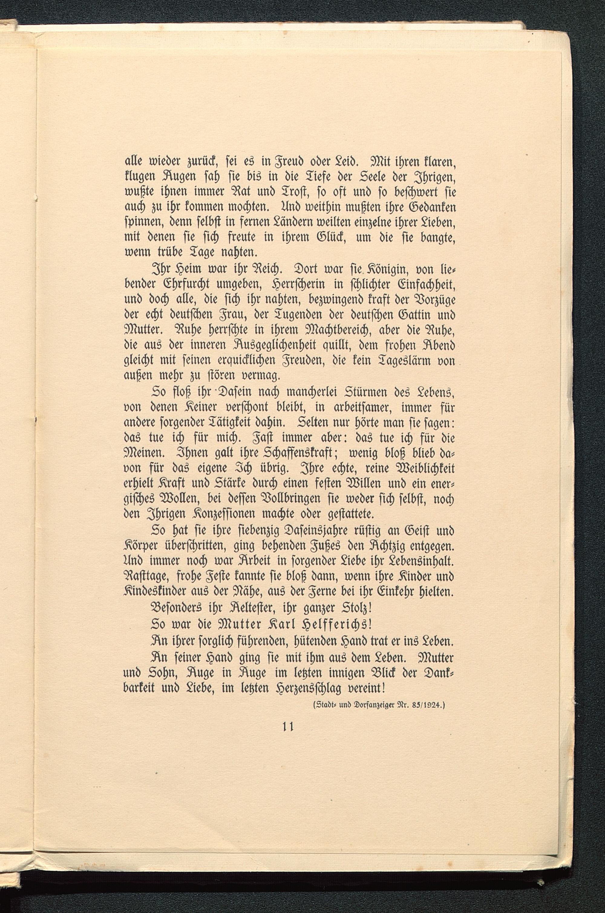 So hat sie ihre siebenzig Daseinsjahre rüstig an Geist undKörper überschritten, ging behenden Fußes den Achtzig entgegen.Und immer noch war Arbeit in sorgender Liebe ihr Lebensinhalt.Rasttage, frohe Feste kannte sie bloß dann, wenn ihre Kinder undKindeskinder aus der Nähe, aus der Ferne bei ihr Einkehr hielten.