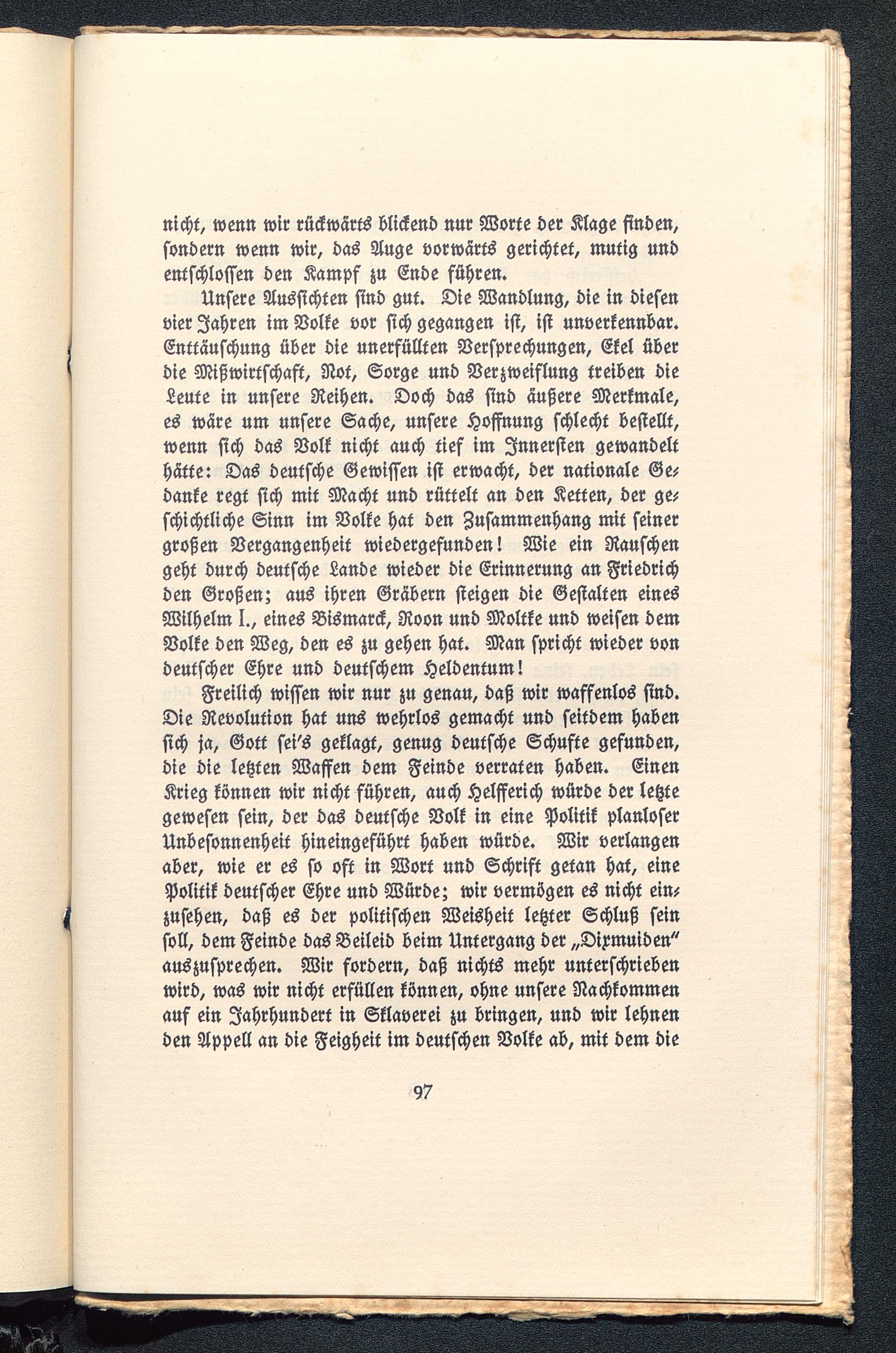 Unsere Aussichten sind gut. Die Wandlung, die in diesenvier Jahren im Volke vor sich gegangen ist, ist unverkennbar.Enttäuschung über die unerfüllten Versprechungen, Ekel überdie Mißwirtschaft, Not, Sorge und Verzweiflung treiben dieLeute in unsere Reihen. Doch das sind äußere Merkmale,es wäre um unsere Sache, unsere Hoffnung schlecht bestellt,wenn sich das Volk nicht auch tief im Innersten gewandelthätte: Das deutsche Gewissen ist erwacht, der nationale Ge-danke regt sich mit Macht und rüttelt an den Ketten, der ge-schichtliche Sinn im Volke hat den Zusammenhang mit seinergroßen Vergangenheit wiedergefunden! Wie ein Rauschengeht durch deutsche Lande wieder die Erinnerung an Friedrichden Großen; aus ihren Gräbern steigen die Gestalten einesWilhelm I. , eines Bismarck, Roon und Moltke und weisen demVolke den Weg, den es zu gehen hat. Man spricht wieder vondeutscher Ehre und deutschem Heldentum!