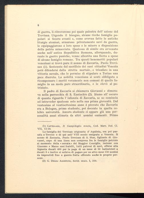 di guerra, li ritroveremo poi quale palestra dell' azione delTrevisan. Urgendo il bisogno, alcune ricche famiglie po-polari si fecero avanti e, come avevan fatto le anticheliturgie ateniesi, armarono privatamente navi da guerra,,le equipaggiarono a loro spese e le misero a disposizionedella patria minacciata. Qualcosa di simile era avvenutoanche nell' antica Repubblica Romana, allorquando, du-rante le guerre puniche, venne allestita una flotta a spesedi alcune famiglie romane. Tra questi benemeriti popolariveneziani si trovò pure il nonno di Zaccaria, Paolo Trevi-san (1). Sostenuta dal sacrificio dei suoi cittadini Veneziapotè difendersi dalla stretta mortale, e trionfare in unavittoria navale, che le permise di stipulare a Torino unapace discreta. La nobiltà veneziana si sentì obbligata aricompensare i meriti veramente non comuni di quelle fa-miglie in un modo pure straordinario, e le elevò al pa-triziato.
