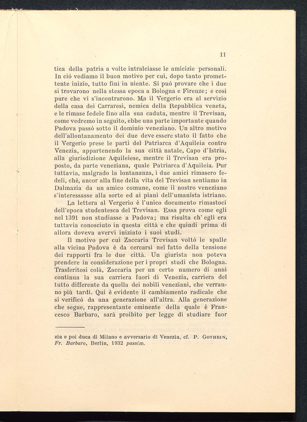La lettera al Vergerio è l'unico documento rimastocidell'epoca studentesca del Trevisan. Essa prova come eglinel 1391 non studiasse a Padova ; ma risulta eh' egli eratuttavia conosciuto in questa città e che quindi prima diallora doveva avervi iniziato i suoi studi.