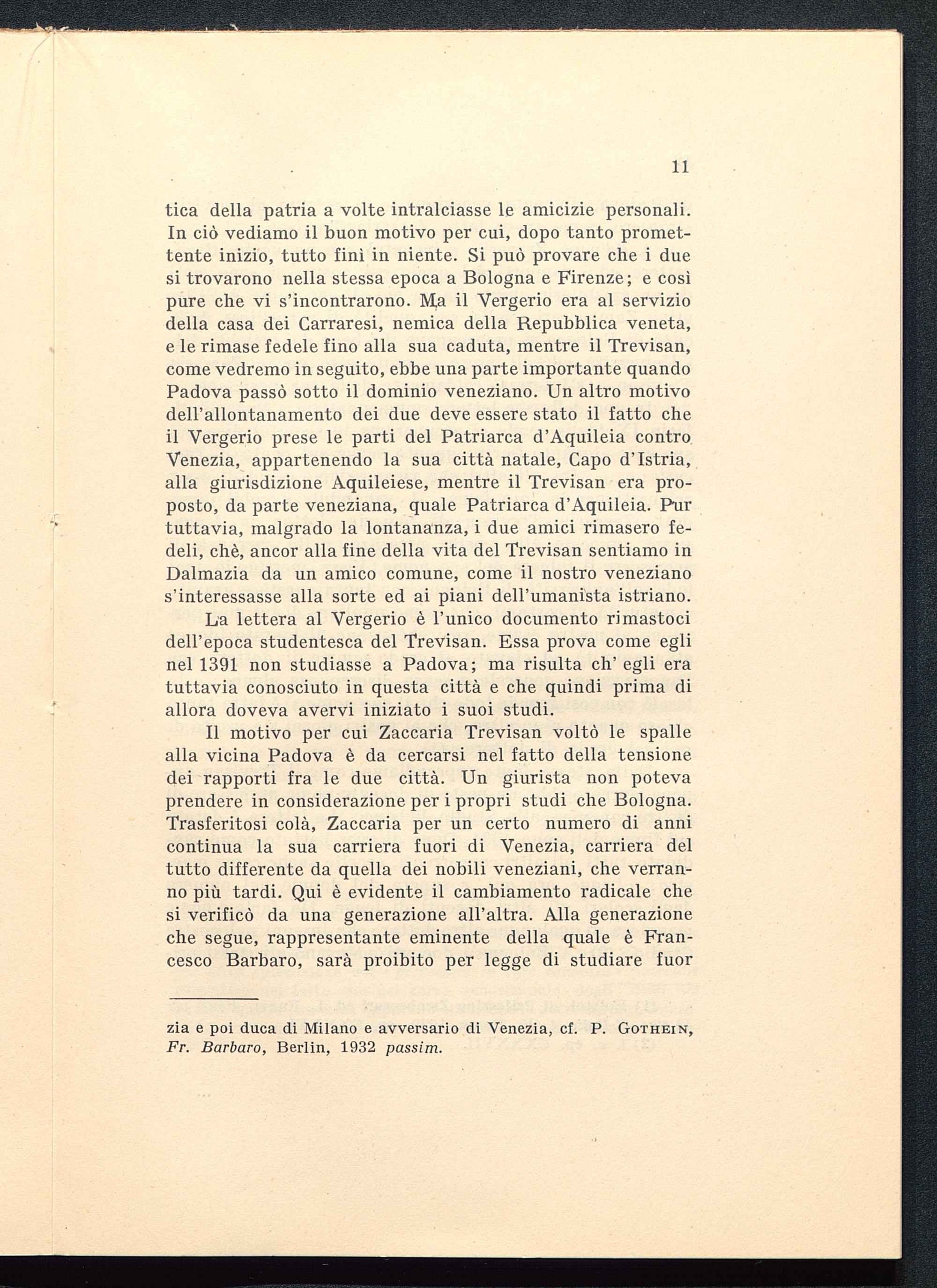 Il motivo per cui Zaccaria Trevisan voltò le spallealla vicina Padova è da cercarsi nel fatto della tensionedei rapporti fra le due città. Un giurista non potevaprendere in considerazione per i propri studi che Bologna .Trasferitosi colà, Zaccaria per un certo numero di annicontinua la sua carriera fuori di Venezia, carriera deltutto differente da quella dei nobili veneziani, che verran-no più tardi. Qui è evidente il cambiamento radicale chesi verificò da una generazione all'altra. Alla generazioneche segue, rappresentante eminente della quale è Fran-cesco Barbaro , sarà proibito per legge di studiare fuor