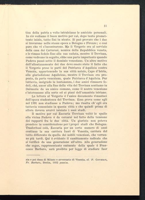 tica della patria a volte intralciasse le amicizie personali.In ciò vediamo il buon motivo per cui, dopo tanto promet-tente inizio, tutto finì in niente. Si può provare che i duesi trovarono nella stessa epoca a Bologna e Firenze ; e cosìpure che vi s'incontrarono. Ma il Vergerio era al serviziodella casa dei Carraresi, nemica della Repubblica veneta,e le rimase fedele fino alla sua caduta, mentre il Trevisan,come vedremo in seguito, ebbe una parte importante quandoPadova passò sotto il dominio veneziano. Un altro motivodell'allontanamento dei due deve essere stato il fatto cheil Vergerio prese le parti del Patriarca d'Aquileia controVenezia, appartenendo la sua città natale, Capo d'Istria,alla giurisdizione Aquileiese, mentre il Trevisan era pro-posto, da parte veneziana, quale Patriarca d'Aquileia. Purtuttavia, malgrado la lontananza, i due amici rimasero fe-deli, chè, ancor alla fine della vita del Trevisan sentiamo inDalmazia da un amico comune, come il nostro venezianos'interessasse alla sorte ed ai piani dell'umanista istriano.