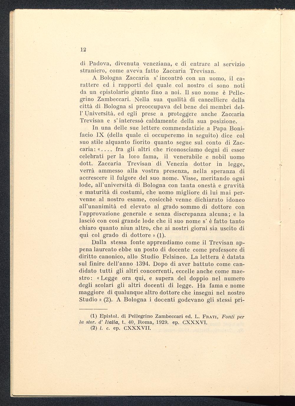 In una delle sue lettere commendatizie a Papa Boni-facio IX (della quale ci occuperemo in seguito) dice colsuo stile alquanto fiorito quanto segue sul conto di Zac-caria: «.... fra gli altri che riconosciamo degni di essercelebrati per la loio fama, il venerabile e nobil uomodott. Zaccaria Trevisan di Venezia dottor in legge,verrà ammesso alla vostra presenza, nella speranza diaccrescere il fulgore del suo nome. Visse, meritando ognilode, all'università di Bologna con tanta onestà e gravitàe maturità di costumi, che uomo migliore di lui mai per-venne al nostro esame, cosicché venne dichiarato idoneoall'unanimità ed elevato al grado sommo di dottore conl'approvazione generale e senza discrepanza alcuna; e lalasciò con così grande lode che il suo nome s' è fatto tantochiaro quanto niun altro, che ai nostri giorni sia uscito diqui col grado di dottore » (1).