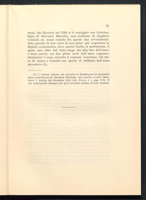 moni, che Zaccaria nel 1394 si è coniugato con Caterina,figlia di Giovanni Marcello, non crediamo di sbagliarevedendo un nesso causale fra questi due avvenimenti.Solo quando fu ben certo di non poter più acquistare ladignità ecclesiastica, deve essersi risolto al matrimonio, ilquale non ebbe del resto luogo che alla line dell'anno;e forse ancora nei due primi mesi dell' anno seguente,iniziandosi 1' anno, secondo il costume veneziano, dal me-se di marzo e finendo con quello di febbraio dell'annosuccessivo (1).