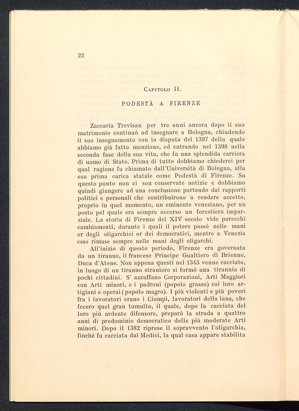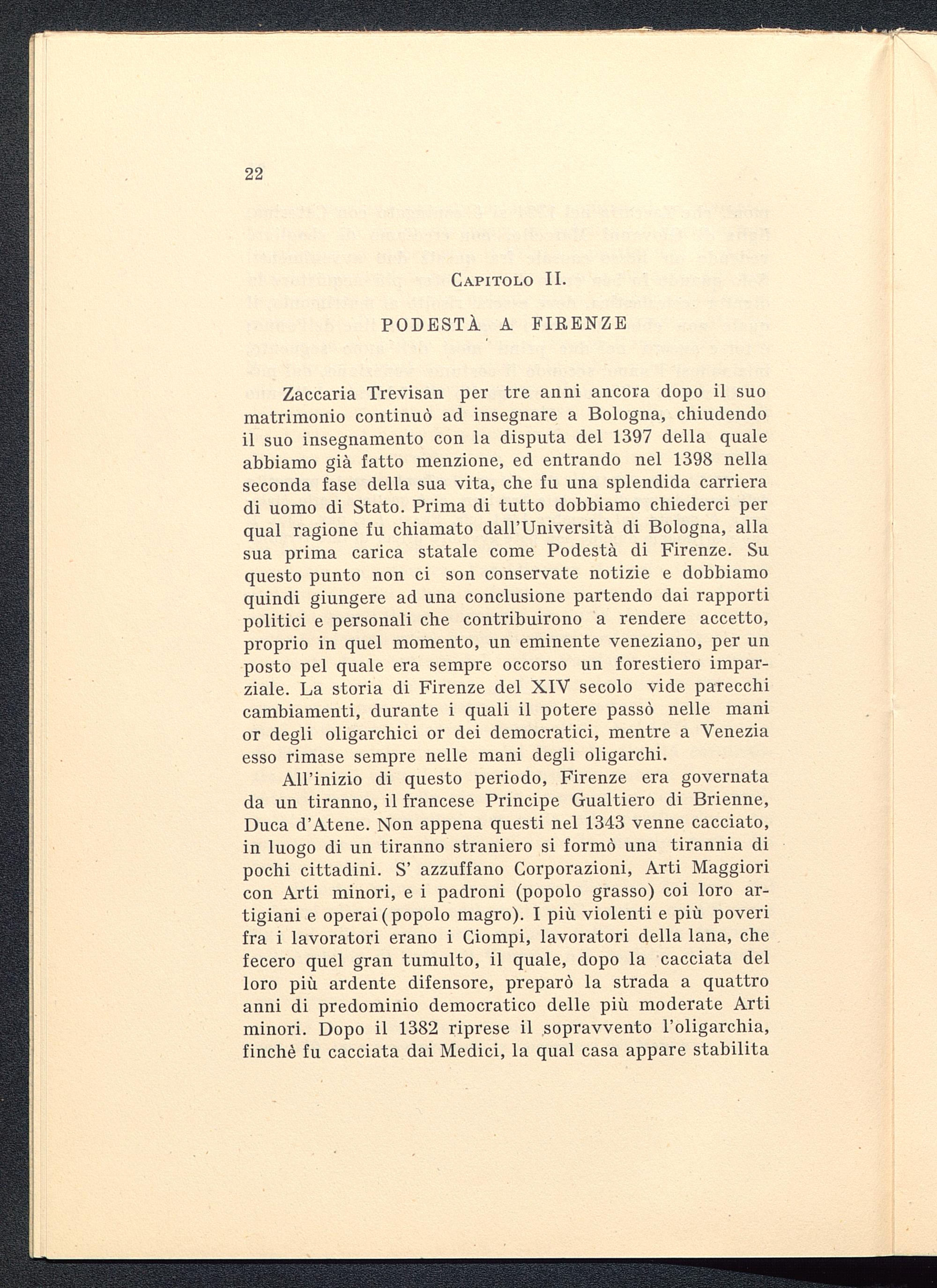 Zaccaria Trevisani per tre anni ancora dopo il suomatrimonio continuò ad insegnare a Bologna , chiudendoil suo insegnamento con la disputa del 1397 della qualeabbiamo già fatto menzione, ed entrando nel 1398 nellaseconda fase della sua vita, che fu una splendida carrieradi uomo di Stato. Prima di tutto dobbiamo chiederci perqual ragione fu chiamato dall'Università di Bologna , allasua prima carica statale come Podestà di Firenze . Suquesto punto non ci son conservate notizie e dobbiamoquindi giungere ad una conclusione partendo dai rapportipolitici e personali che contribuirono a rendere accetto,proprio in quel momento, un eminente veneziano, per unposto pel quale era sempre occorso un forestiero impar-ziale. La storia di Firenze del XIV secolo vide parecchicambiamenti, durante i quali il potere passò nelle manior degli oligarchici or dei democratici, mentre a Veneziaesso rimase sempre nelle mani degli oligarchi.