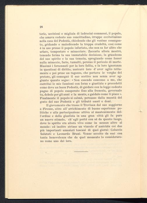Il giovamento che trasse il Trevisan dal suo soggiornoa Firenze , oltre all' arrichimento di buone esperienze po-litiche e alla partecipazione attiva al mantenimento del-l'ordine e della giustizia in una gran città gli fu pureun nuovo stimolo, eh' egli portò con sè da questo luogo,dove lo spirito era allora vivo come in nessun altro almondo : ed inoltre strinse un vincolo d' amicizia coi duepiù importanti umanisti toscani di quei giorni: ColuccioSalutati e Leonardo Bruni . Venne accolto da essi contanta benevolenza che da quel momento lo consideraro-no come uno dei loro.