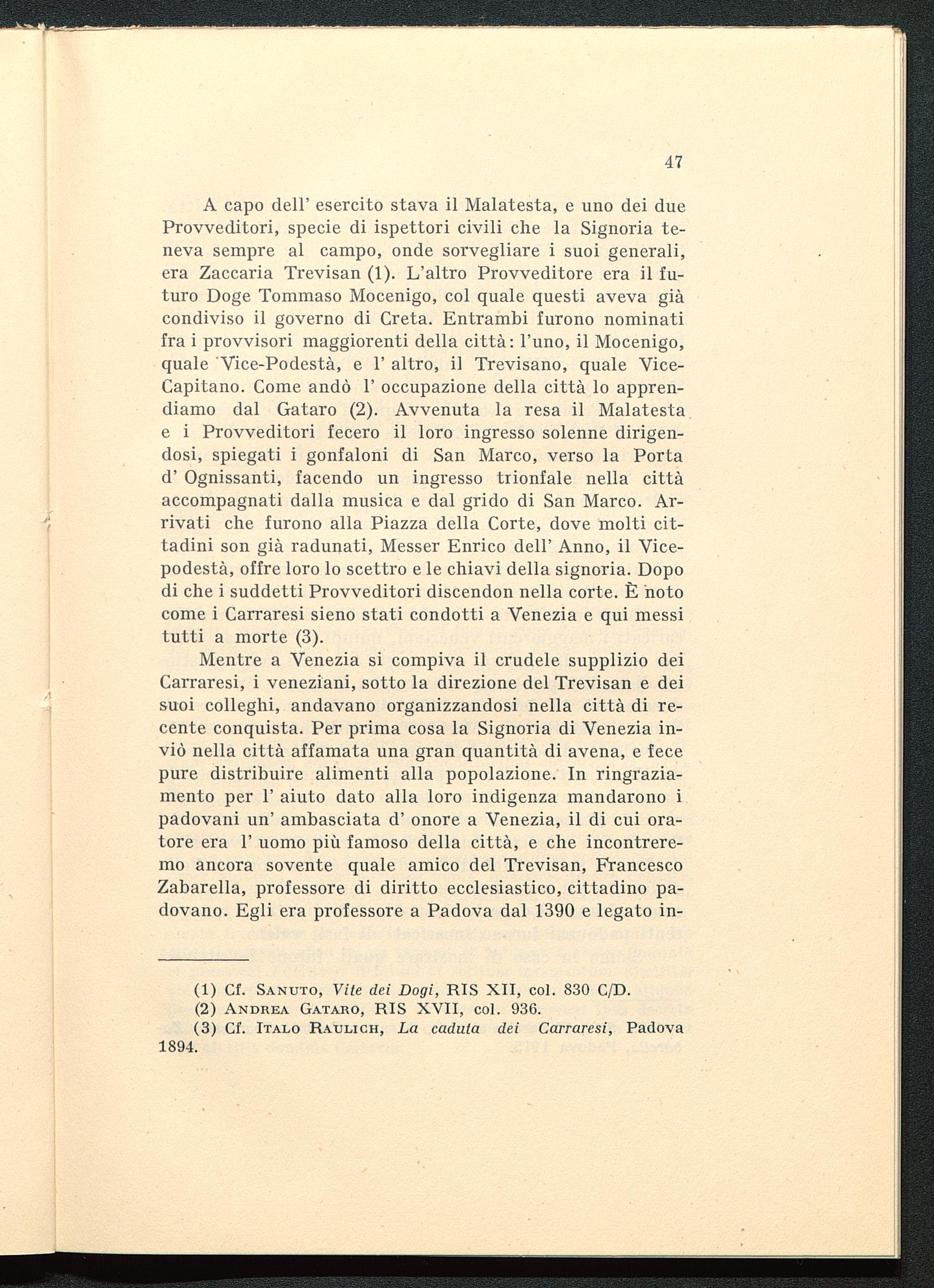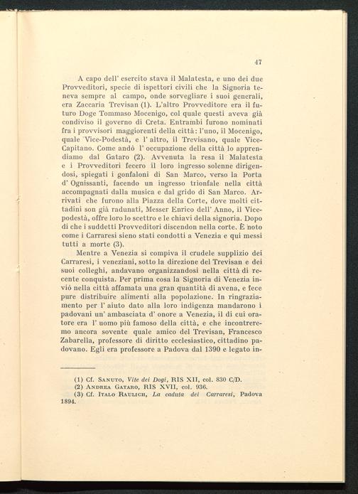 A capo dell' esercito stava il Malatesta, e uno dei dueProvveditori, specie di ispettori civili che la Signoria te-neva sempre al campo, onde sorvegliare i suoi generali,era Zaccaria Trevisan (1). L'altro Provveditore era il fu-turo Doge Tommaso Mocenigo , col quale questi aveva giàcondiviso il governo di Creta . Entrambi furono nominatifra i provvisori maggiorenti della città: l'uno, il Mocenigo,quale Vice-Podestà, e 1' altro, il Trevisano, quale Vice-Capitano. Come andò 1' occupazione della città lo appren-diamo dal Gataro (2). Avvenuta la resa il Malatestae i Provveditori fecero il loro ingresso solenne dirigen-dosi, spiegati i gonfaloni di San Marco, verso la Portad' Ognissanti, facendo un ingresso trionfale nella cittàaccompagnati dalla musica e dal grido di San Marco. Ar-rivati che furono alla Piazza della Corte, dove molti cit-tadini son già radunati, Messer Enrico dell' Anno, il Vice-podestà, offre loro lo scettro e le chiavi della signoria. Dopodi che i suddetti Provveditori discendon nella corte. È "notocome i Carraresi sieno stati condotti a Venezia e qui messitutti a morte (3).
