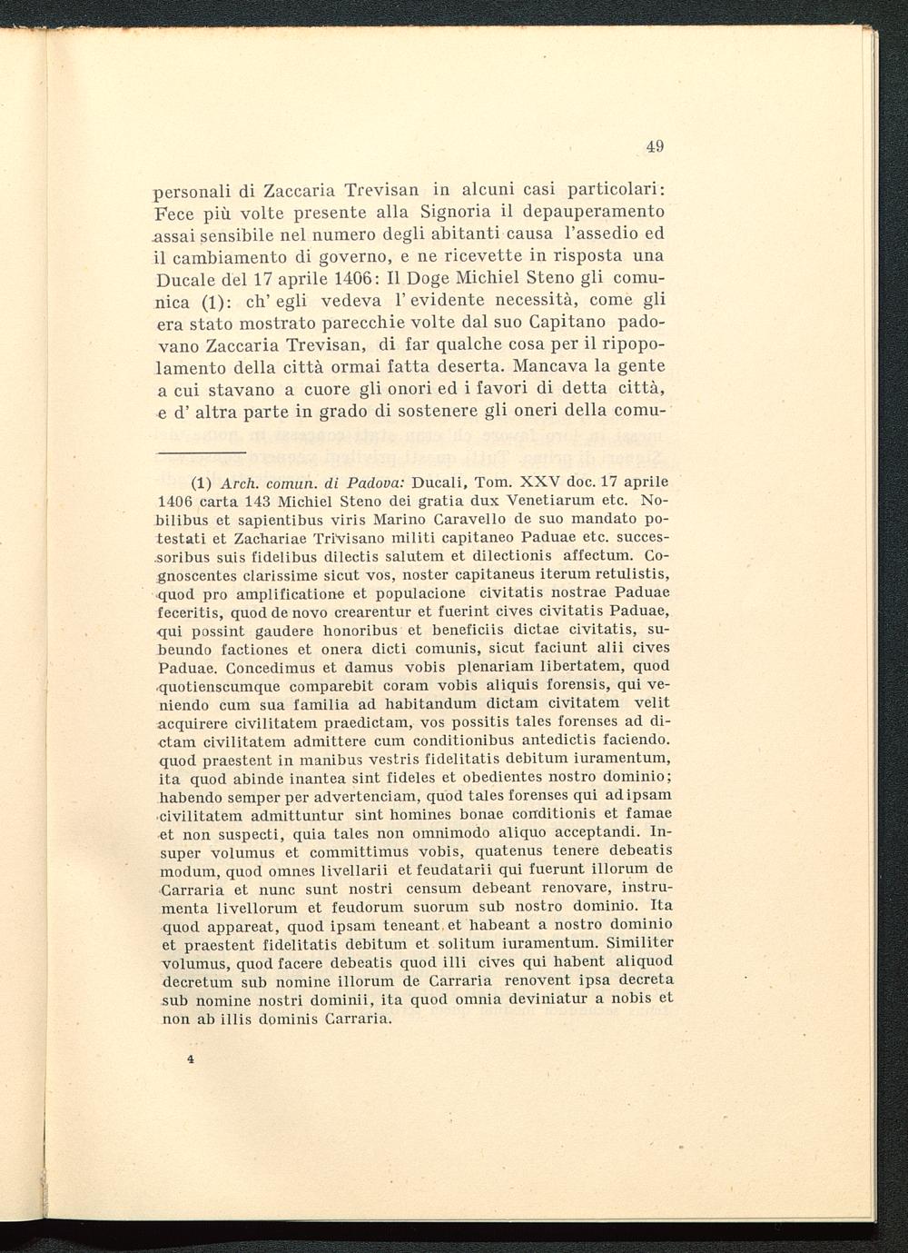ti) Arch. commi, di Padova: Ducali, Tom. XXV doc. 17 aprile1406 carta 143 Michiel Steno dei gratia dux Venetiarum etc. No-bilibus et sapientibus viris Marino Caravello de suo mandato po-testati et Zachariae TriVisano militi capitaneo Paduae etc. succes-soribus suis fidelibus dilectis salutem et dilectionis affectum. Co-gnoscentes clarissime sicut vos, noster capitaneus iterum retulistis,quod prò amplificatione et populacione civitatis nostrae Paduaefeceritis, quod de novo crearentur et fuerint cives civitatis Paduae,•qui possint gaudere honoribus et beneficiis dictae civitatis, su-beundo factiones et onera dicti comunis, sicut faciunt alii civesPaduae. Goncedimus et damus vobis plenariam libertatem, quod■quotienscumque comparebit coram vobis aliquis forensis, qui ve-niendo cum sua familia ad habitandum dictam civitatem velitacquirere civilitatem praedictam, vos possitis tales forenses ad di-ctam civilitatem admittere cum conditionibus antedictis faciendo.quod praestent in manibus vestris fidelitatis debitum iuramentum,ita quod abinde inantea sint fideles et obedientes nostro dominio;habendo semper per advertenciam, quod tales forenses qui adipsamcivilitatem admittuntur sint homines bonae conditionis et famae-et non suspecti, quia tales non omnimodo aliquo acceptandi. In-super volumus et committimus vobis, quatenus tenere debeatismodum, quod omnes livellarii et feudatarii qui fuerunt illorum deCarraria et nunc sunt nostri censum debeant renovare, instru-menta livellorum et feudorum suorum sub nostro dominio. Itaquod appareat, quod ipsam teneant et habeant a nostro dominioet praestent fidelitatis debitum et solitum iuramentum. Similitervolumus, quod facere debeatis quod illi cives qui habent aliquoddecretum sub nomine illorum de Carraria renovent ipsa decretasub nomine nostri domimi, ita quod omnia deviniatur a nobis etnon ab illis dominis Garraria.