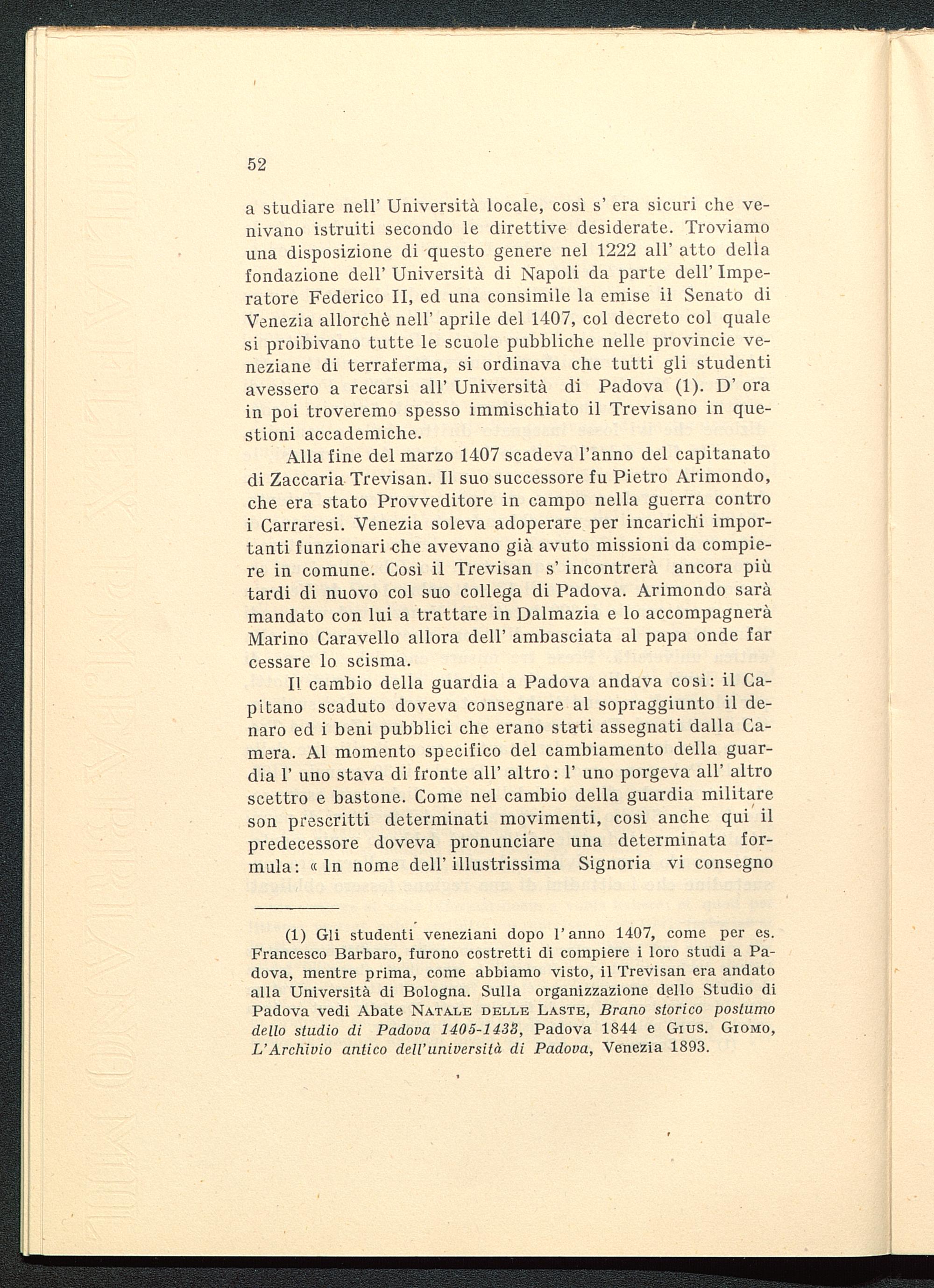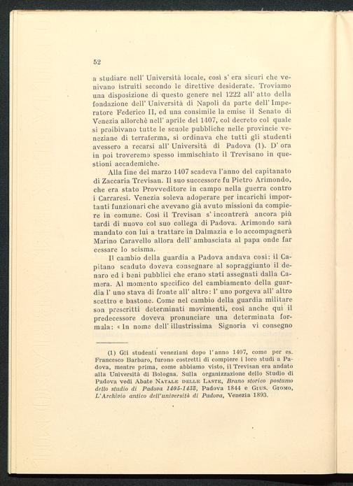a studiare nell' Università locale, così s' era sicuri che ve-nivano istruiti secondo le direttive desiderate. Troviamouna disposizione di questo genere nel 1222 all' atto dellafondazione dell' Università di Napoli da parte dell' Impe-ratore Federico II, ed una consimile la emise il Senato diVenezia allorché nell' aprile del 1407, col decreto col qualesi proibivano tutte le scuole pubbliche nelle provincie ve-neziane di terraferma, si ordinava che tutti gli studentiavessero a recarsi all' Università di Padova (1). D' orain poi troveremo spesso immischiato il Trevisano in que-stioni accademiche.