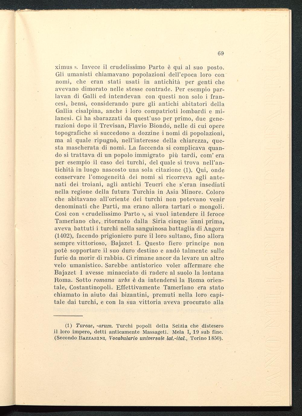 ximus ». Invece il crudelissimo Parto è qui al suo posto.Gli umanisti chiamavano popolazioni dell'epoca loro connomi, che eran stati usati in antichità per genti cheavevano dimorato nelle stesse contrade. Per esempio par-lavan di Galli ed intendevan con questi non solo i fran-cesi, bensì, considerando pure gli antichi abitatori dellaGallia cisalpina , anche i loro compatrioti lombardi e mi-lanesi. Ci ha sbarazzati da quest'uso per primo, due gene-razioni dopo il Trevisan, Flavio Biondo , nelle di cui operetopografiche si succedono a dozzine i nomi di popolazioni,ma al quale ripugnò, nell'interesse della chiarezza, que-sta mascherata di nomi. La faccenda si complicava quan-do si trattava di un popolo immigrato più tardi, com' eraper esempio il caso dei turchi, del quale si trova nell'an-tichità in luogo nascosto una sola citazione (1), Qui, ondeconservare l'omogeneità dei nomi si ricorreva agli ante-nati dei troiani, agli antichi Teucri che s'eran insediatinella regione della futura Turchia in Asia Minore. Coloroche abitavano all'oriente dei turchi non potevano venirdenominati che Parti, ma erano allora tartari o mongoli.Così con « crudelissimo Parto », si vuol intendere il feroceTamerlano che, ritornato dalla Siria cinque anni prima,aveva battuti i turchi nella sanguinosa battaglia di Angora(1402), facendo prigioniero pure il loro sultano, fino allorasempre vittorioso, Bajazet I . Questo fiero principe nonpotè sopportare il suo duro destino e andò talmente sullefurie da morir di rabbia. Ci rimane ancor da levare un altrovelo umanistico. Sarebbe antistorico voler affermare cheBajazet I avesse minacciato di radere al suolo la lontanaRoma. Sotto romana urbs è da intendersi la Roma orien-tale, Costantinopoli. Effettivamente Tamerlano era statochiamato in aiuto dai bizantini , premuti nella loro capi-tale dai turchi, e con la sua vittoria aveva procurato alla