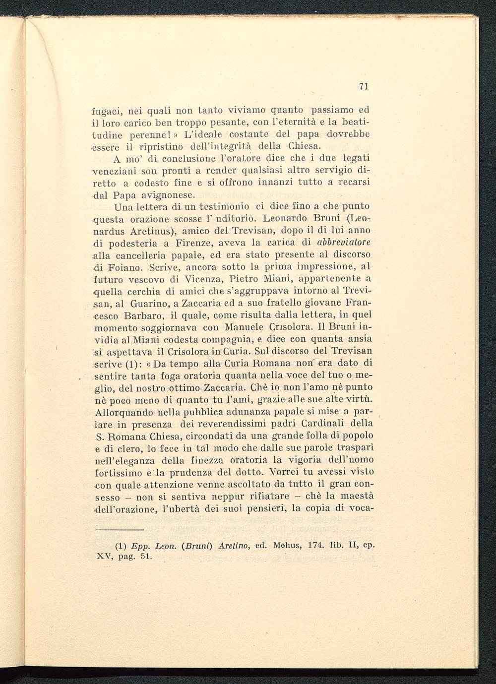 Una lettera di un testimonio ci dice fino a che puntoquesta orazione scosse 1' uditorio. Leonardo Bruni (Leo-nardus Aretinus), amico del Trevisan, dopo il di lui anno■di podesteria a Firenze , aveva la carica di abbreviatorealla cancelleria papale, ed era stato presente al discorsodi Foiano . Scrive, ancora sotto la prima impressione, alfuturo vescovo di Vicenza , Pietro Miani, appartenente a■quella cerchia di amici che s'aggruppava intorno al Trevi-san, al Guarino, a Zaccaria ed a suo fratello giovane Fran-cesco Barbaro, il quale, come risulta dalla lettera, in quelmomento soggiornava con Manuele Cnsolora. Il Bruni in-vidia al Miani codesta compagnia, e dice con quanta ansiasi aspettava il Crisolora in Curia. Sul discorso del Trevisanscrive (1): « Da tempo alla Curia Bomana non^~era dato disentire tanta foga oratoria quanta nella voce del tuo o me-glio, del nostro ottimo Zaccaria. Chè io non l'amo nè puntouè poco meno di quanto tu l'ami, grazie alle sue alte virtù.Allorquando nella pubblica adunanza papale si mise a par-lare in presenza dei reverendissimi padri Cardinali dellaS. Bomana Chiesa, circondati da una grande folla di popoloe di clero, lo fece in tal modo che dalle sue parole trasparìnell'eleganza della finezza oratoria la vigoria dell'uomofortissimo e la prudenza del dotto. Vorrei tu avessi visto■con quale attenzione venne ascoltato da tutto il gran con-sesso - non si sentiva neppur rifiatare - chè la maestàdell'orazione, l'ubertà dei suoi pensieri, la copia di voca-