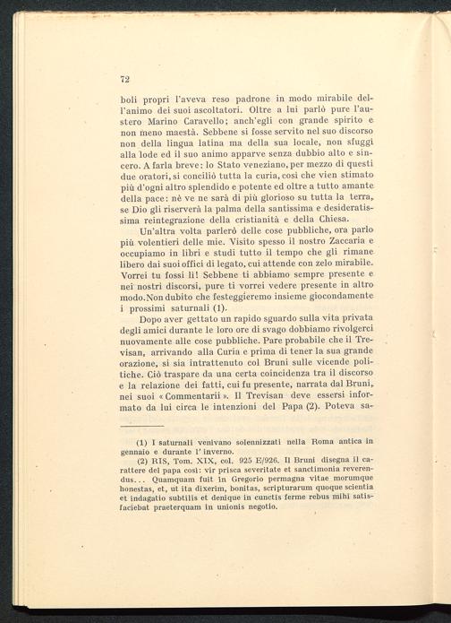 Dopo aver gettato un rapido sguardo sulla vita privatadegli amici durante le loro ore di svago dobbiamo rivolgercinuovamente alle cose pubbliche. Pare probabile che il Tre-visan, arrivando alla Curia e prima di tener la sua grandeorazione, si sia intrattenuto col Bruni sulle vicende poli-tiche. Ciò traspare da una certa coincidenza tra il discorsoe la relazione dei fatti, cui fu presente, narrata dal Bruni,,nei suoi « Commentarii ». Il Trevisan deve essersi infor-mato da lui circa le intenzioni del Papa (2). Poteva sa-