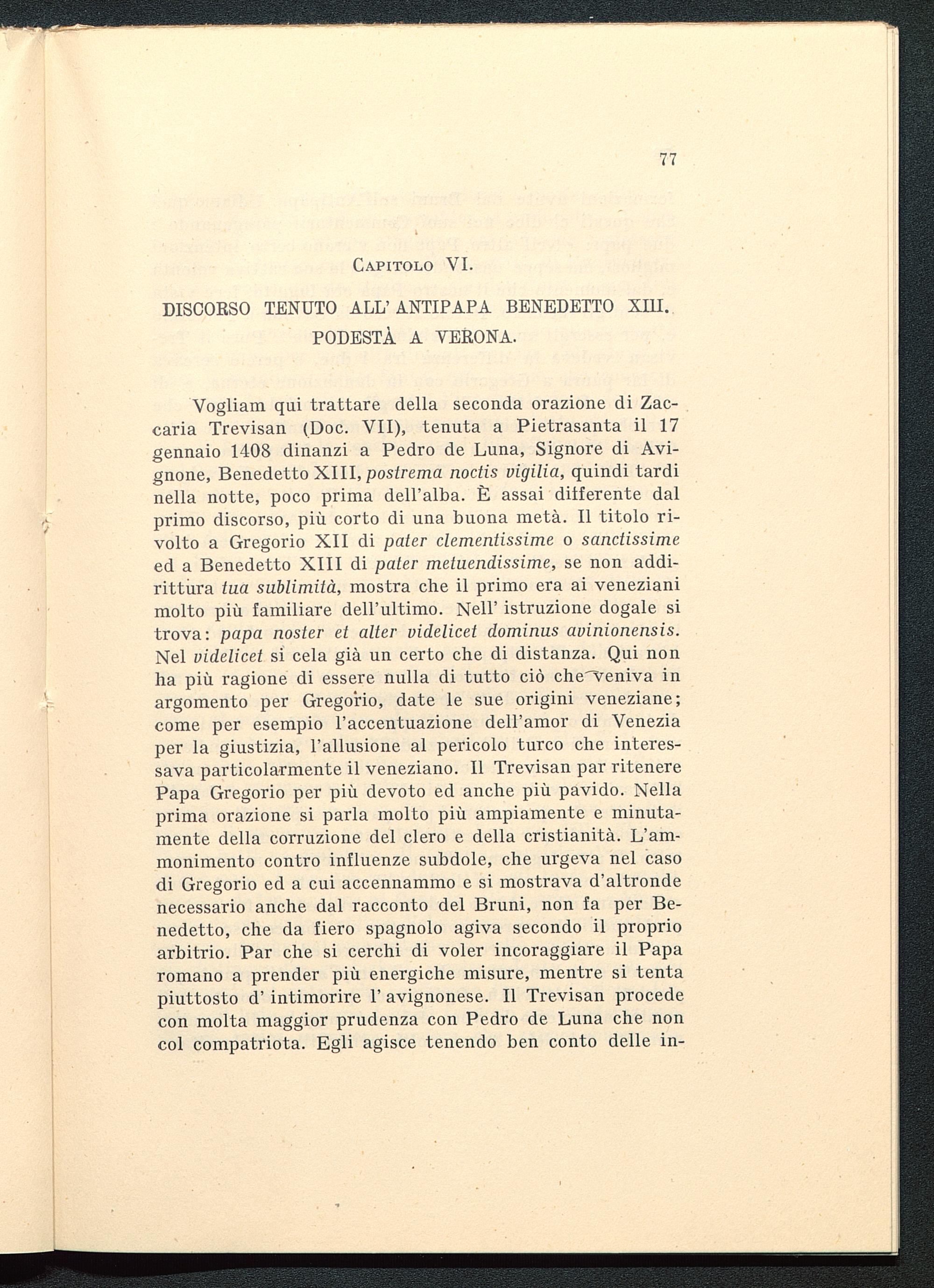 Vogliam qui trattare della seconda orazione di Zac-caria Trevisan (Doc. VII), tenuta a Pietrasanta il 17gennaio 1408 dinanzi a Pedro de Luna, Signore di Avi-gnone, Benedetto XIII , postrema noctis vigilia, quindi tardinella notte, poco prima dell'alba. È assai deferente dalprimo discorso, più corto di una buona metà. Il titolo ri-volto a Gregorio XII di pater clementissime o sandissimeed a Benedetto XIII di pater metuendissime, se non addi-rittura tua sublimità, mostra che il primo era ai venezianimolto più familiare dell'ultimo. Neil' istruzione dogale sitrova: papa noster et alter videlicet dominus avinionensis.Nel videlicet si cela già un certo che di distanza. Qui nonha più ragione di essere nulla di tutto ciò che'veniva inargomento per Gregorio, date le sue origini veneziane;come per esempio l'accentuazione dell'amor di Veneziaper la giustizia, l'allusione al pericolo turco che interes-sava particolarmente il veneziano. Il Trevisan par ritenerePapa Gregorio per più devoto ed anche più pavido. Nellaprima orazione si parla molto più ampiamente e minuta-mente della corruzione del clero e della cristianità. L'am-monimento contro influenze subdole, che urgeva nel casodi Gregorio ed a cui accennammo e si mostrava d'altrondenecessario anche dal racconto del Bruni, non fa per Be-nedetto, che da fiero spagnolo agiva secondo il proprioarbitrio. Par che si cerchi di voler incoraggiare il Paparomano a prender più energiche misure, mentre si tentapiuttosto d' intimorire 1' avignonese. Il Trevisan procedecon molta maggior prudenza con Pedro de Luna che noncol compatriota. Egli agisce tenendo ben conto delle in-