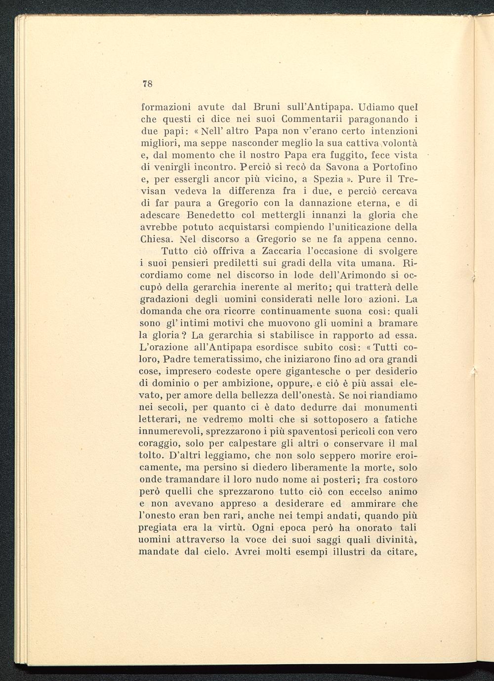 formazioni avute dal Bruni sull'Antipapa. Udiamo quelche questi ci dice nei suoi Commentarli paragonando idue papi: «Nell'altro Papa non v'erano certo intenzionimigliori, ma seppe nasconder meglio la sua cattiva volontàe, dal momento che il nostro Papa era fuggito, fece vistadi venirgli incontro. Perciò si recò da Savona a Portofino e, per essergli ancor più vicino, a Spezia ». Pure il Tre-visan vedeva la differenza fra i due, e perciò cercavadi far paura a Gregorio con la dannazione eterna, e diadescare Benedetto col mettergli innanzi la gloria cheavrebbe potuto acquistarsi compiendo l'uniticazione dellaChiesa. Nel discorso a Gregorio se ne fa appena cenno.