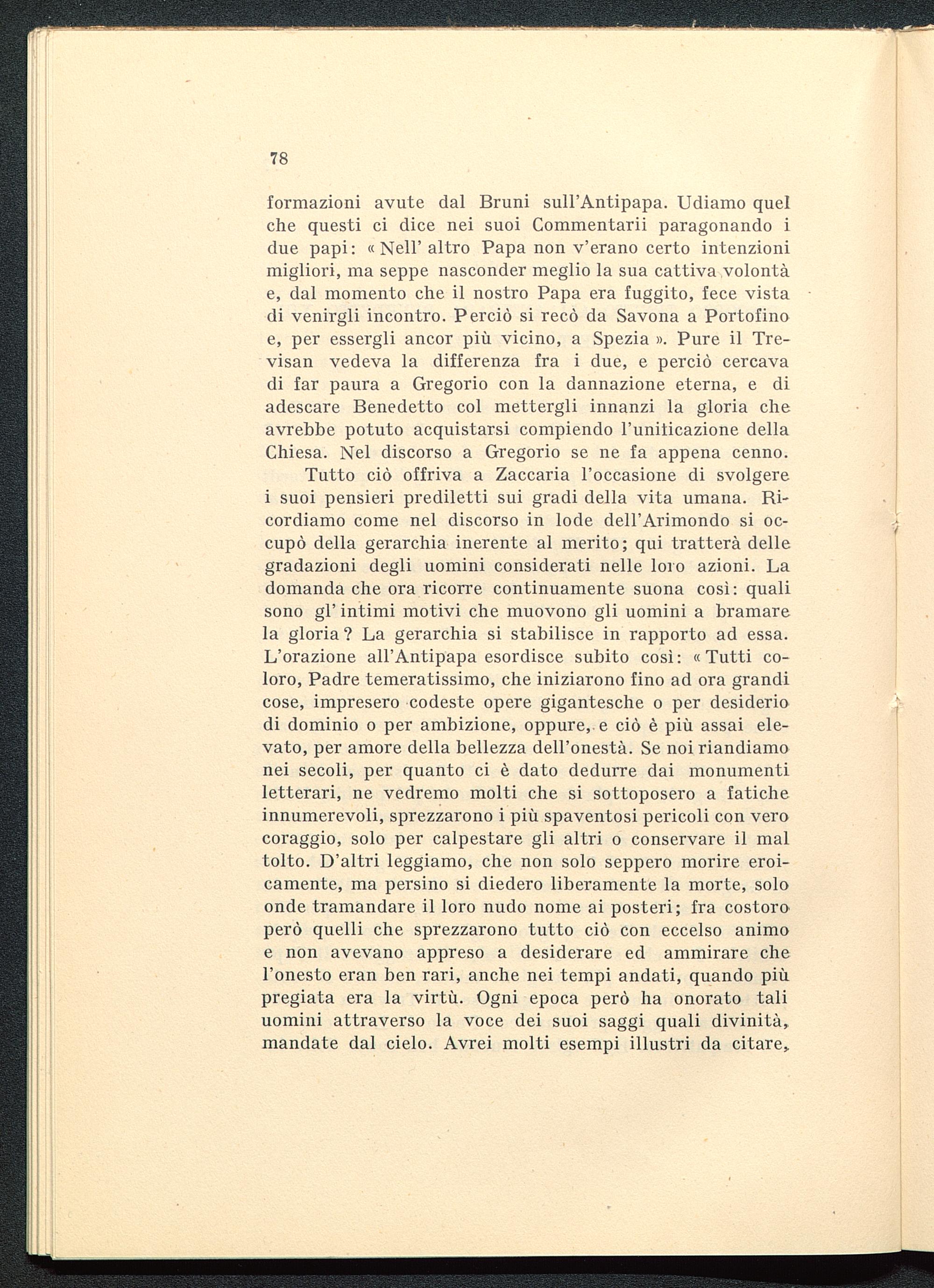 Tutto ciò offriva a Zaccaria l'occasione di svolgerei suoi pensieri prediletti sui gradi della vita umana. Ri-cordiamo come nel discorso in lode dell'Arimondo si oc-cupò della gerarchia inerente al merito; qui tratterà dellegradazioni degli uomini considerati nelle loro azioni. Ladomanda che ora ricorre continuamente suona così: qualisono gì' intimi motivi che muovono gli uomini a bramarela gloria ? La gerarchia si stabilisce in rapporto ad essa.L'orazione all'Antipapa esordisce subito così: «Tutti co-loro, Padre temeratissimo, che iniziarono fino ad ora grandicose, impresero codeste opere gigantesche o per desideriodi dominio o per ambizione, oppure, e ciò è più assai ele-vato, per amore della bellezza dell'onestà. Se noi riandiamonei secoli, per quanto ci è dato dedurre dai monumentiletterari, ne vedremo molti che si sottoposero a faticheinnumerevoli, sprezzarono i più spaventosi pericoli con verocoraggio, solo per calpestare gli altri o conservare il maltolto. D'altri leggiamo, che non solo seppero morire eroi-camente, ma persino si diedero liberamente la morte, soloonde tramandare il loro nudo nome ai posteri; fra costoroperò quelli che sprezzarono tutto ciò con eccelso animoe non avevano appreso a desiderare ed ammirare chel'onesto eran ben rari, anche nei tempi andati, quando piùpregiata era la virtù. Ogni epoca però ha onorato taliuomini attraverso la voce dei suoi saggi quali divinità,mandate dal cielo. Avrei molti esempi illustri da citare»