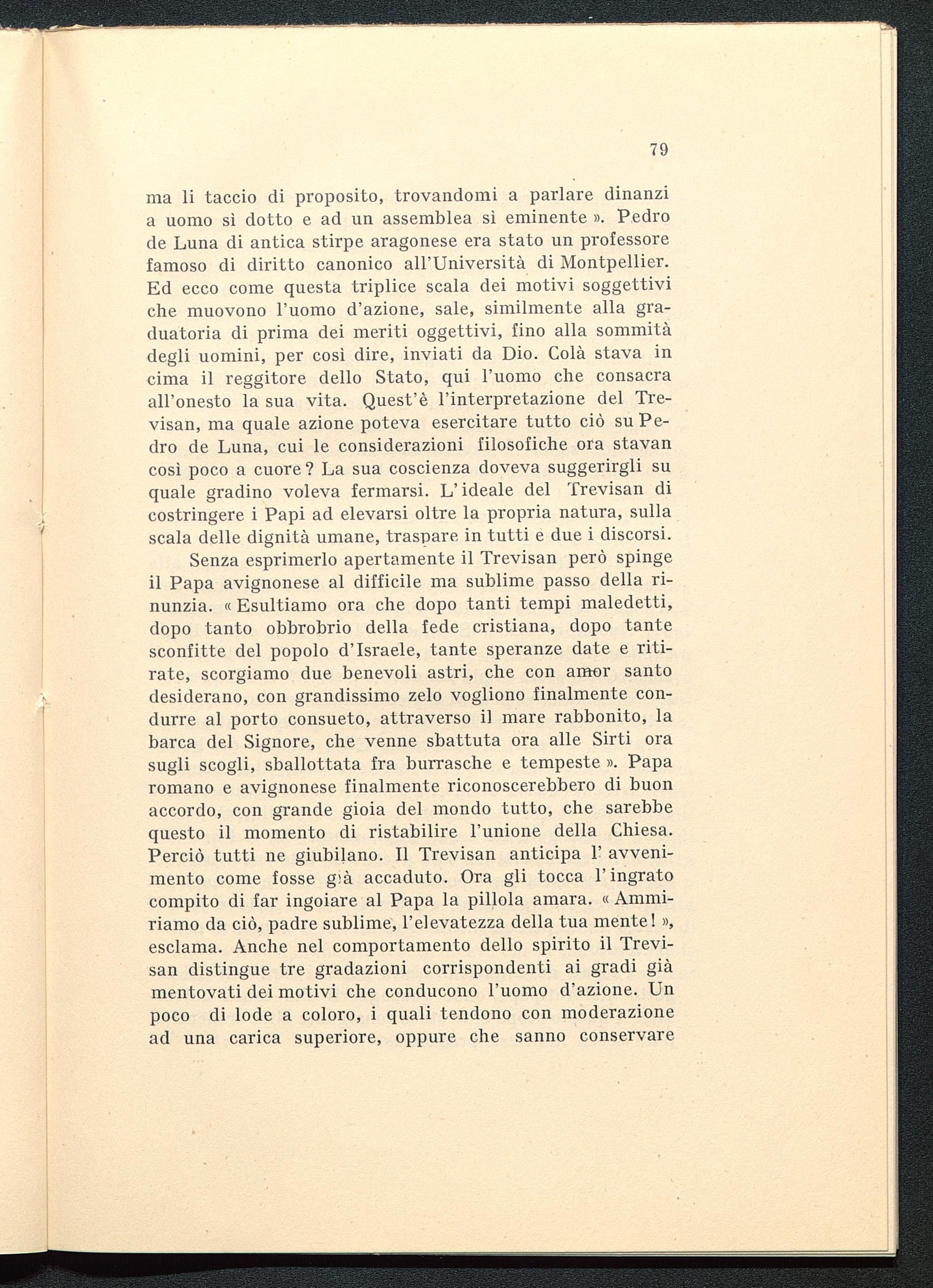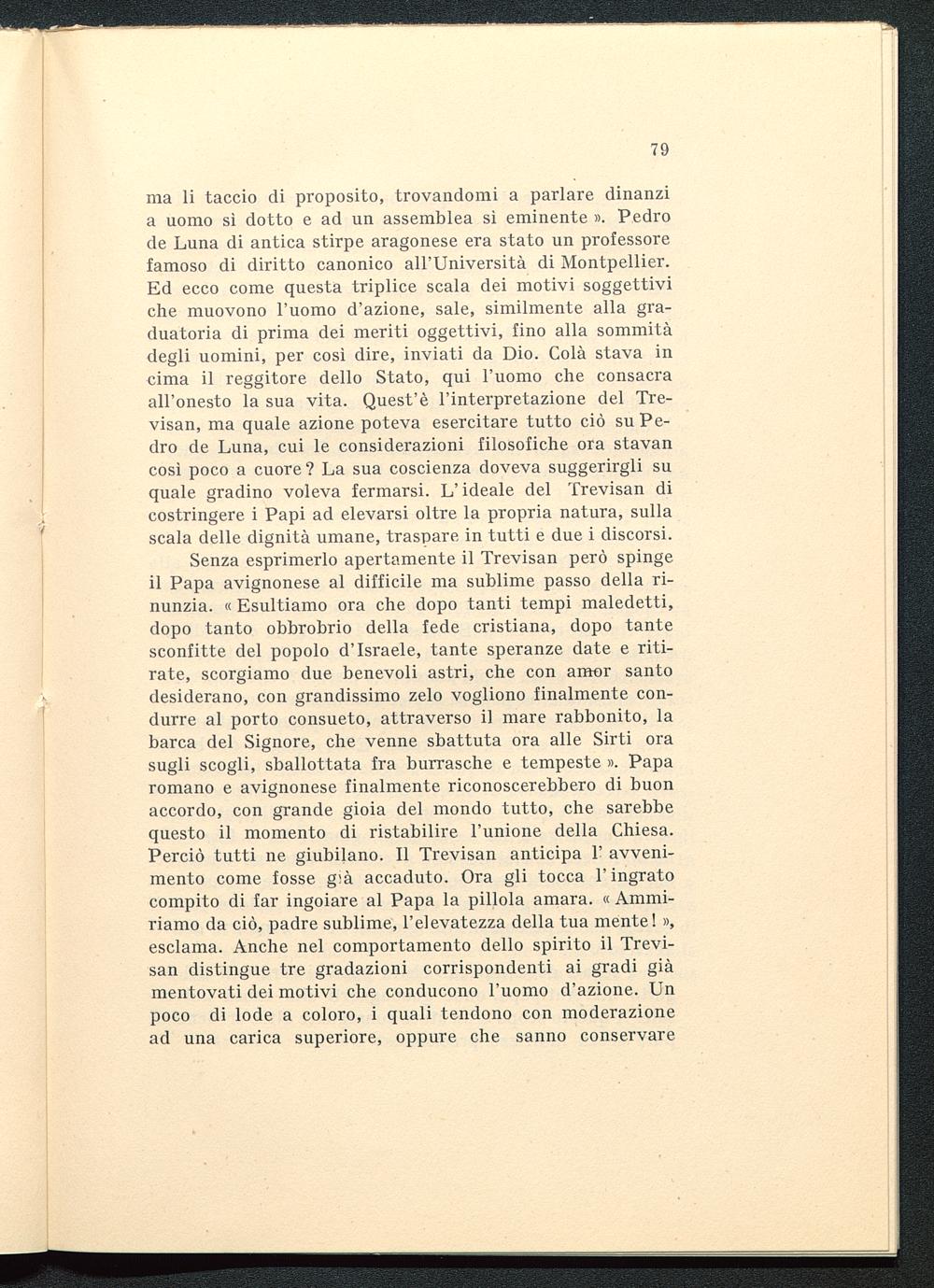 ma li taccio di proposito, trovandomi a parlare dinanzia uomo sì dotto e ad un assemblea sì eminente ». Pedrode Luna di antica stirpe aragonese era stato un professorefamoso di diritto canonico all'Università di Montpellier.Ed ecco come questa triplice scala dei motivi soggettiviche muovono l'uomo d'azione, sale, similmente alla gra-duatoria di prima dei meriti oggettivi, fino alla sommitàdegli uomini, per così dire, inviati da Dio . Colà stava incima il reggitore dello Stato, qui l'uomo che consacraall'onesto la sua vita. Quest'è l'interpretazione del Tre-visan, ma quale azione poteva esercitare tutto ciò su Pe-dro de Luna , cui le considerazioni filosofiche ora stavancosì poco a cuore ? La sua coscienza doveva suggerirgli suquale gradino voleva fermarsi. L'ideale del Trevisan dicostringere i Papi ad elevarsi oltre la propria natura, sullascala delle dignità umane, traspare in tutti e due i discorsi.