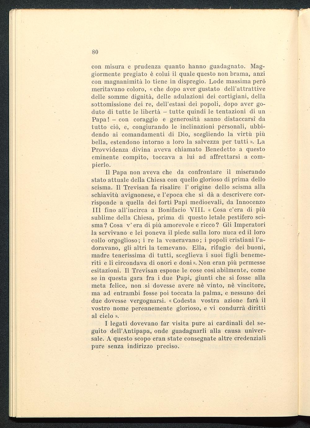 Il Papa non aveva che da confrontare il miserandostato attuale della Chiesa con quello glorioso di prima delloscisma. Il Trevisan fa risalire 1' origine dello scisma allaschiavitù avignonese, e l'epoca che si dà a descrivere cor-risponde a quella dei forti Papi medioevali, da InnocenzoIII fino all'incirca a Bonifacio Vili. « Cosa c'era di piùsublime della Chiesa, prima di questo letale pestifero sci-sma ? Cosa v' era di più amorevole e ricco ? Gli Imperatorila servivano e lei poneva il piede sulla loro nuca ed il lorocollo orgoglioso; i re la veneravano; i popoli cristiani l'a-doravano, gli altri la temevano. Ella, rifugio dei buoni,madre tenerissima di tutti, sceglieva i suoi figli beneme-riti e li circondava di onori e doni ». Non eran più permesseesitazioni. Il Trevisan espone le cose così abilmente, comese in questa gara fra i due Papi, giunti che si fosse allameta felice, non . si dovesse avere nè vinto, nè vincitore,ma ad entrambi fosse poi toccata la palma, e nessuno deidue dovesse vergognarsi. « Codesta vostra azione farà ilvostro nome perennemente glorioso, e vi condurrà dirittial cielo ».