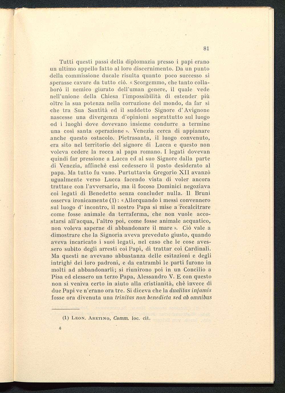 Tutti questi passi della diplomazia presso i papi eranoun ultimo appello fatto al loro discernimento. Da un punto-della commissione ducale risulta quanto poco successo sisperasse cavare da tutto ciò. « Scorgemmo, che tanto colla-borò il nemico giurato dell'uman genere, il quale vedenell'unione della Chiesa l'impossibilità di estender piùoltre la sua potenza nella corruzione del mondo, da far sìche tra Sua Santità ed il suddetto Signore d'Avignone nascesse una divergenza d'opinioni soprattutto sul luogood i luoghi dove dovevano insieme condurre a termineuna così santa operazione ». Venezia cerca di appianareanche questo ostacolo. Pietrasanta , il luogo convenuto,era sito nel territorio del signore di Lucca e questo nonvoleva cedere la rocca al papa romano. I legati dovevanquindi far pressione a Lucca ed al suo Signore dalla partedi "Venezia, affinchè essi cedessero il posto desiderato alpapa. Ma tutto fu vano. Purtuttavia Gregorio XII avanzòugualmente verso Lucca facendo vista di voler ancoratrattale con l'avversario, ma il focoso Dominici negoziavacoi legati di Benedetto senza concluder nulla. Il Bruniosserva ironicamente (1) : «Allorquando i messi convennerosul luogo d'incontro, il nostro Papa si mise a "recalcitrarecome fosse animale da terraferma, che non vuole acco-starsi all'acqua, l'altro poi, come fosse animale acquatico,non voleva saperne di abbandonare il mare ». Ciò vale adimostrare che la Signoria aveva preveduto giusto, quandoaveva incaricato i suoi legati, nel caso che le cose aves-sero subito degli arresti coi Papi , di trattar coi Cardinali.Ma questi ne avevano abbastanza delle esitazioni e degliintrighi dei loro padroni, e da entrambi le parti furono inmolti ad abbandonarli; si riunirono poi in un Concilio aPisa ed elessero un terzo Papa, Alessandro V. E con questonon si veniva certo in aiuto alla cristianità, chè invece didue Papi ve n'erano ora tre. Si diceva che la dualitas infamisfosse ora divenuta una trinitas non benedicta sed ab omnibus