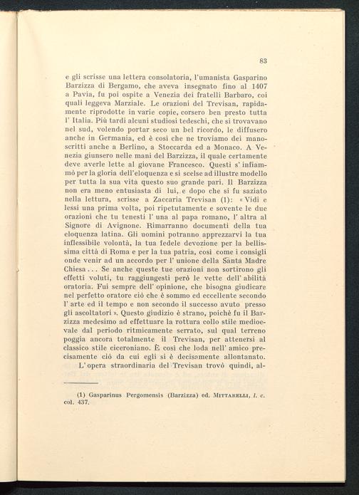 e gli scrisse una lettera consolatoria, l'umanista GasparinoBarzizza di Bergamo , che aveva insegnato fino al 1407a Pavia , fu poi ospite a Venezia dei fratelli Barbaro, coiquali leggeva Marziale . Le orazioni del Trevisan, rapida-mente riprodotte in varie copie, corsero ben presto tuttaF Italia. Più tardi alcuni studiosi tedeschi , che si trovavanonel sud, volendo portar seco un bel ricordo, le diffuseroanche in Germania , ed è così che ne troviamo dei mano-scritti anche a Berlino, a Stoccarda ed a Monaco. A Ve-nezia giunsero nelle mani del Barzizza, il quale certamentedeve averle lette al giovane Francesco. Questi s' infiam-mò per la gloria dell'eloquenza e si scelse ad illustre modelloper tutta la sua vita questo suo grande pari. Il Barzizzanon era meno entusiasta di lui, e dopo che si fu saziatonella lettura, scrisse a Zaccaria Trevisan (1): «Vidi elessi una prima volta, poi ripetutamente e sovente le dueorazioni che tu tenesti F una al papa romano, F altra alSignore di Avignone . Bimarranno documenti della tuaeloquenza latina. Gli uomini potranno apprezzarvi la tuainflessibile volontà, la tua fedele devozione per la bellis-sima città di Boma e per la tua patria, così come i consiglionde venir ad un accordo per F unione della Santa MadreChiesa ... Se anche queste tue orazioni non sortirono glieffetti voluti, tu raggiungesti però le vette dell' abilitàoratoria. Fui sempre dell' opinione, che bisogna giudicarenel perfetto oratore ciò che è sommo ed eccellente secondoF arte ed il tempo e non secondo il successo avuto pressogli ascoltatori ». Questo giudizio è strano, poiché fu il Bar-zizza medesimo ad effettuare la rottura collo stile medioe-vale dal periodo ritmicamente serrato, sul qual terrenopoggia ancora totalmente il Trevisan, per attenersi alclassico stile ciceroniano. È così che loda nell' amico pre-cisamente ciò da cui egli si è decisamente allontanato.L'opera straordinaria del Trevisan trovò quindi, al-