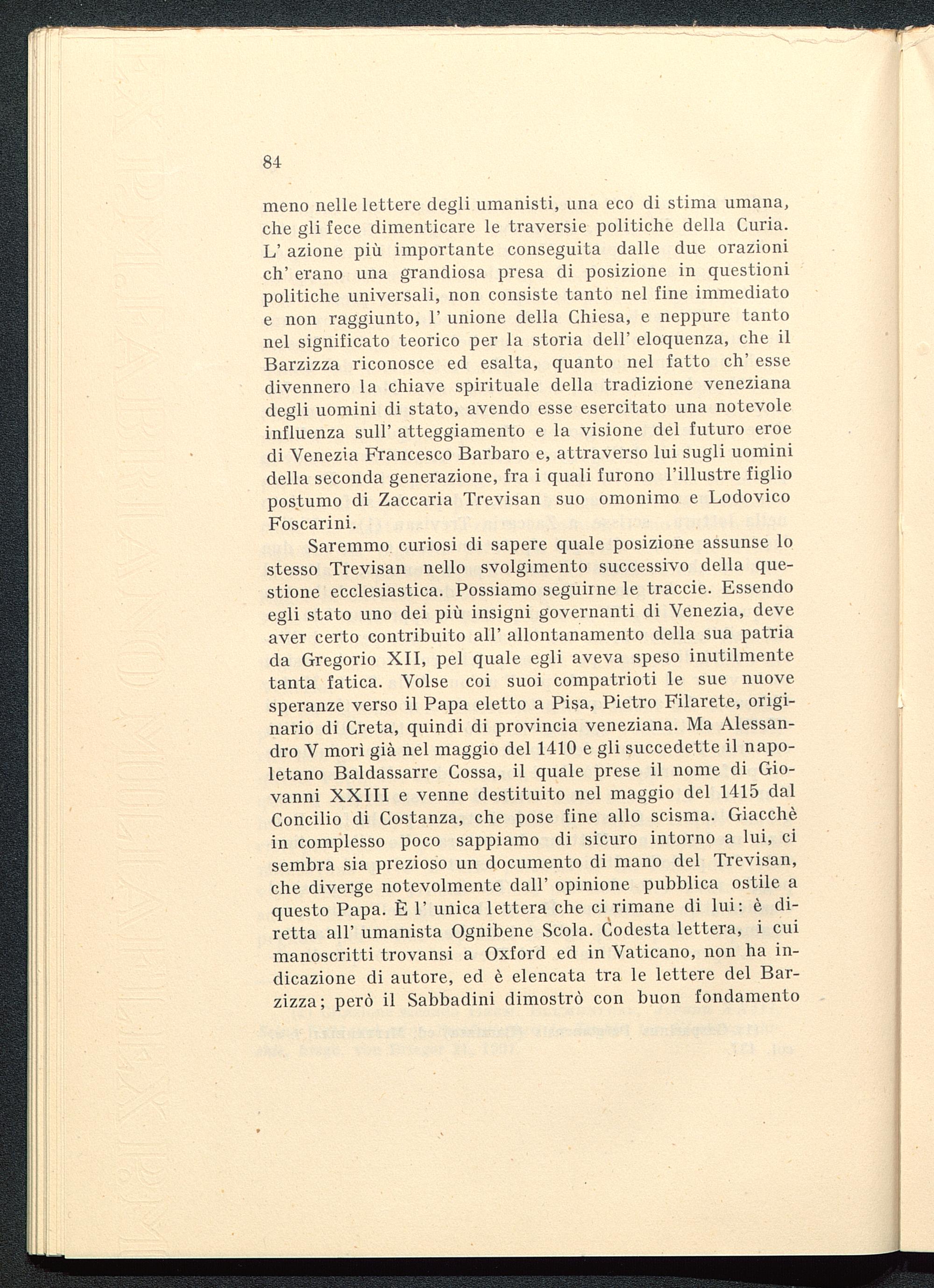 Saremmo curiosi di sapere quale posizione assunse lostesso Trevisan nello svolgimento successivo della que-stione ecclesiastica. Possiamo seguirne le traccie. Essendoegli stato uno dei più insigni governanti di Venezia, deveaver certo contribuito all' allontanamento della sua patriada Gregorio XII , pel quale egli aveva speso inutilmentetanta fatica. Volse coi suoi compatrioti le sue nuovesperanze verso il Papa eletto a Pisa , Pietro Filarete, origi-nario di Creta, quindi di provincia veneziana. Ma Alessan-dro V morì già nel maggio del 1410 e gli succedette il napo-letano Baldassarre Cossa, il quale prese il nome di Gio-vanni XXIII e venne destituito nel maggio del 1415 dalConcilio di Costanza , che pose fine allo scisma. Giacchéin complesso poco sappiamo di sicuro intorno a lui, cisembra sia prezioso un documento di mano del Trevisan,che diverge notevolmente dall' opinione pubblica ostile aquesto Papa. È 1' unica lettera che ci rimane di lui: è di-retta all' umanista Ognibene Scola. Codesta lettera, i cuimanoscritti trovansi a Oxford ed in Vaticano , non ha in-dicazione di autore, ed è elencata tra le lettere del Bar-zizza; però il Sabbadini dimostrò con buon fondamento