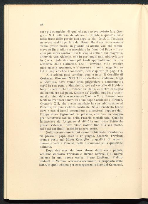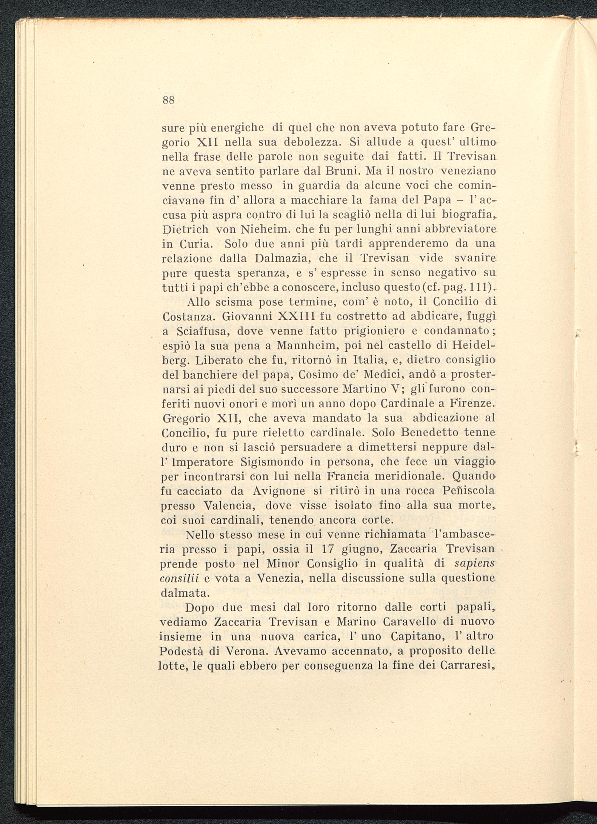 sure più energiche di quel che non aveva potuto fare Gre-gorio XII nella sua debolezza. Si allude a quest' ultimonella frase delle parole non seguite dai fatti. Il Trevisanne aveva sentito parlare dal Bruni. Ma il nostro venezianovenne presto messo in guardia da alcune voci che comin-ciavano fin d' allora a macchiare la fama del Papa - l'ac-cusa più aspra contro di lui la scagliò nella di lui biografia,Dietrich von Nieheim . che fu per lunghi anni abbreviatorein Curia. Solo due anni più tardi apprenderemo da unarelazione dalla Dalmazia , che il Trevisan vide svanirepure questa speranza, e s' espresse in senso negativo sututti i papi ch'ebbe a conoscere, incluso questo (cf. pag. 111).