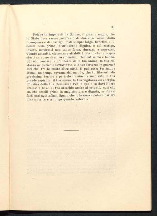 Poiché tu imparasti da Solone , il grande saggio, chelo Stato deve essere governato da due cose, ossia, dallaricompensa e dal castigo, fosti sempre largo, benefico e li-berale nella prima, distribuendo dignità, e nel castigo,invece, mostrasti non tanto forza, durezza e asprezza,quanto umanità, clemenza e affabilità. Per lo che tu acqui-stasti un nome di uomo splendido, clementissimo e buono.Chi non conosce la grandezza della tua anima, la tua co-stanza nel pericolo sovrastante, e la tua fortezza in guerra ?Del che, tra le molte altre città, ti può esser testimoneRoma , un tempo sovrana del mondo, che tu liberasti dagravissimo terrore e pericolo imminente mediante la tuagrande sapienza, il tuo senno, la tua vigilanza ed energia.Chi dirà della tua clemenza? Per la quale tu davi liberoaccesso a te ed al tuo orecchio anche ai privati, così chetu, che eccelli primo in magistratura e dignità, sembravifarti pari agli infimi. Ognun che lo bramava poteva parlaredinanzi a te e a lungo quanto voleva ».
