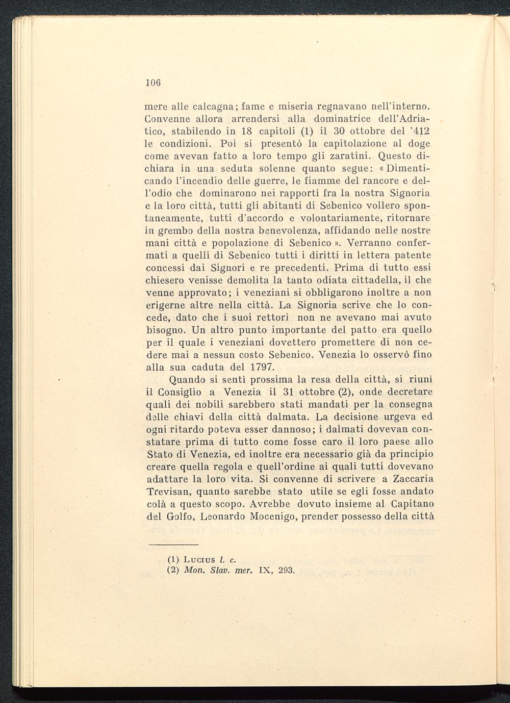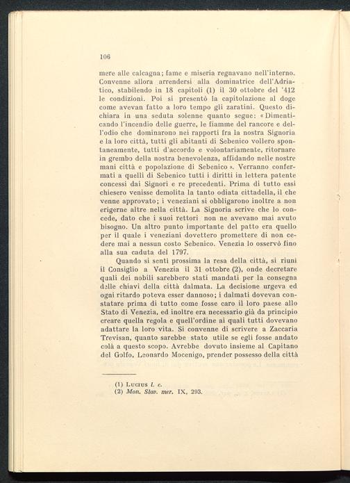 mere alle calcagna; fame e miseria regnavano nell'interno.Convenne allora arrendersi alla dominatrice dell'Adria-tico , stabilendo in 18 capitoli (1) il 30 ottobre del '412le condizioni. Poi si presentò la capitolazione al dogecome avevan fatto a loro tempo gli zaratini. Questo di-chiara in una seduta solenne quanto segue: «Dimenti-cando l'incendio delle guerre, le fiamme del rancore e del-l'odio che dominarono nei rapporti fra la nostra Signoriae la loro città, tutti gli abitanti di Sebenico vollero spon-taneamente, tutti d'accordo e volontariamente, ritornarein grembo della nostra benevolenza, affidando nelle nostremani città e popolazione di Sebenico ». Verranno confer-mati a quelli di Sebenico tutti i diritti in lettera patenteconcessi dai Signori e re precedenti. Prima di tutto essichiesero venisse demolita la tanto odiata cittadella, il chevenne approvato; i veneziani si obbligarono inoltre a nonerigerne altre nella città. La Signoria scrive che lo con-cede, dato che i suoi rettori non ne avevano mai avutobisogno. Un altro punto importante del patto era quelloper il quale i veneziani dovettero promettere di non ce-dere mai a nessun costo Sebenico. Venezia lo osservò finoalla sua caduta del 1797.