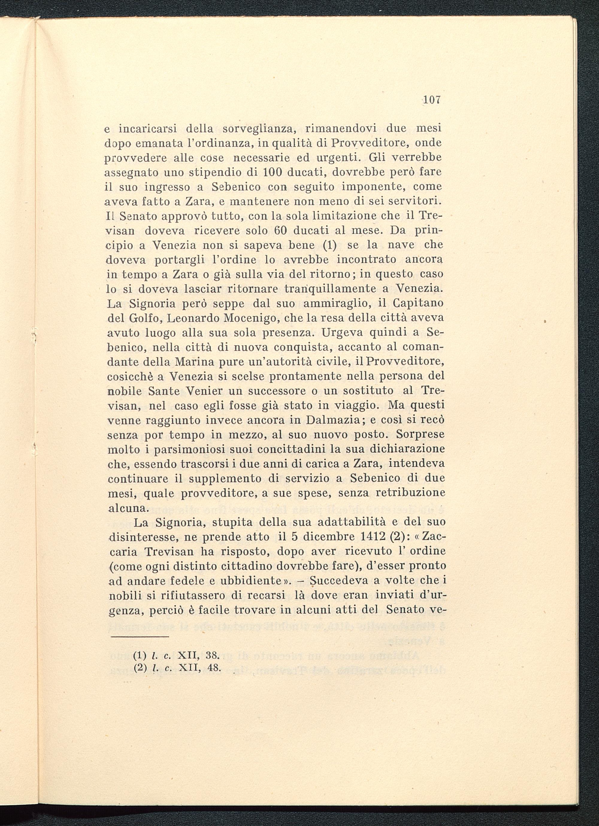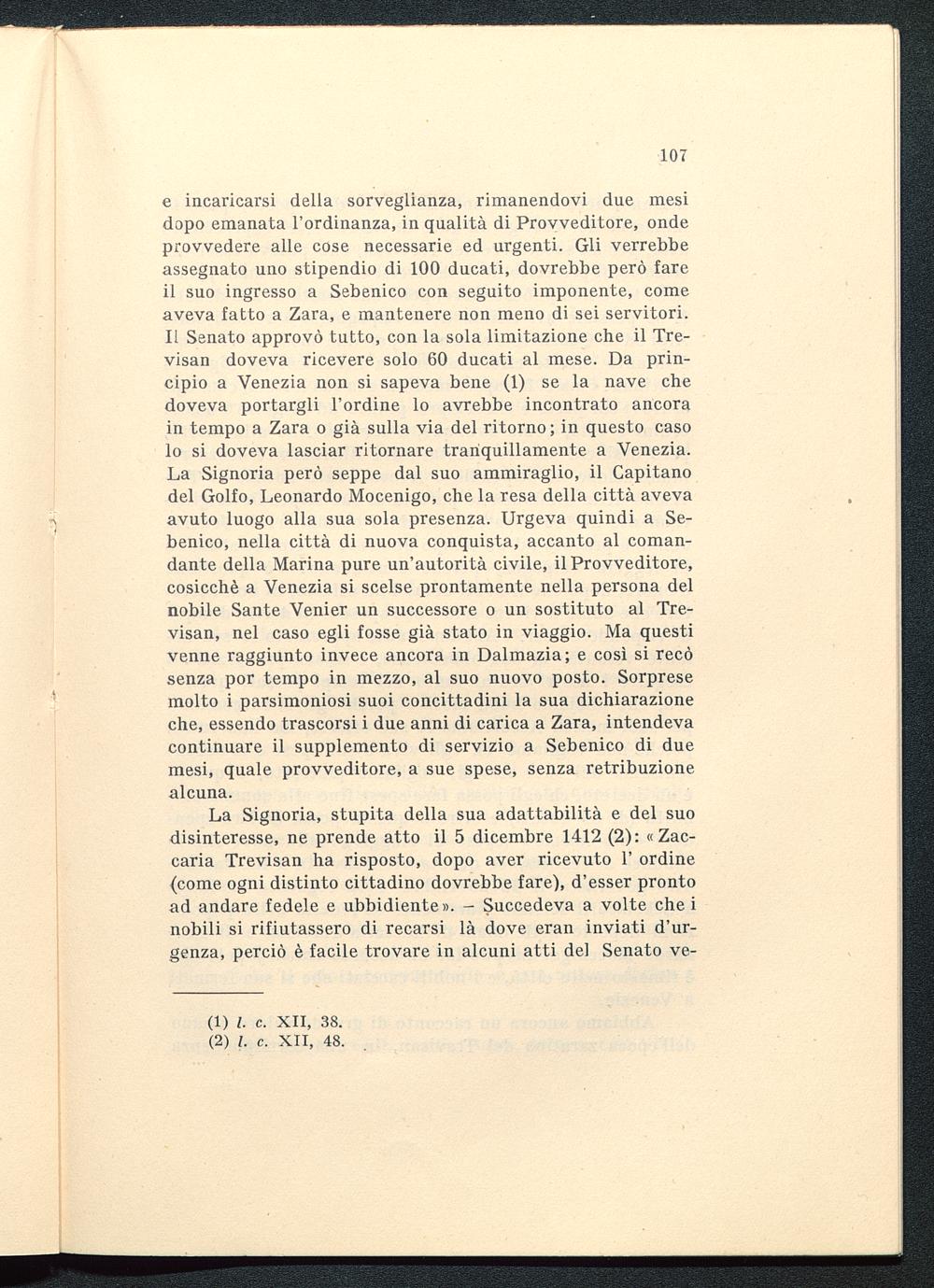 La Signoria, stupita della sua adattabilità e del suodisinteresse, ne prende atto il 5 dicembre 1412 (2): «Zac-caria Trevisan ha risposto, dopo aver ricevuto 1' ordine(come ogni distinto cittadino dovrebbe fare), d'esser prontoad andare fedele e ubbidiente». - Succedeva a volte che inobili si rifiutassero di recarsi là dove eran inviati d'ur-genza, perciò è facile trovare in alcuni atti del Senato ve-