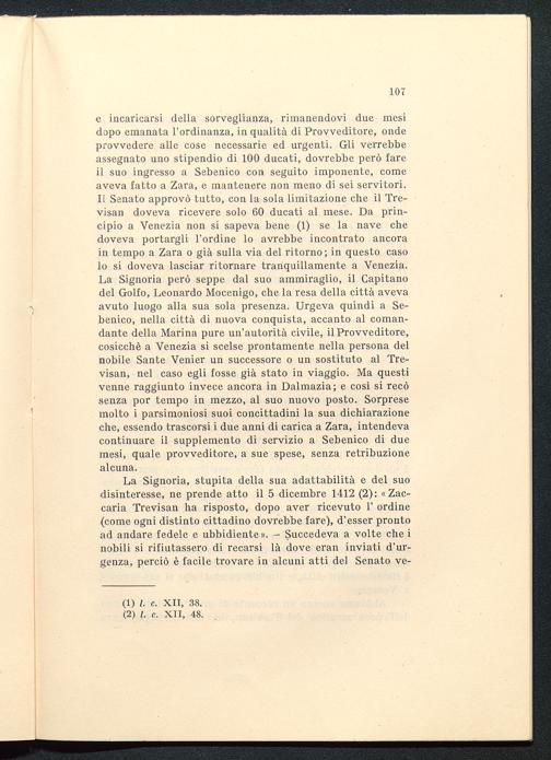 e incaricarsi della sorveglianza, rimanendovi due mesidopo emanata l'ordinanza, in qualità di Provveditore, ondeprovvedere alle cose necessarie ed urgenti. Gli verrebbeassegnato uno stipendio di 100 ducati, dovrebbe però fareil suo ingresso a Sebenico con seguito imponente, comeaveva fatto a Zara , e mantenere non meno di sei servitori.Il Senato approvò tutto, con la sola limitazione che il Tre-visan doveva ricevere solo 60 ducati al mese. Da prin-cipio a Venezia non si sapeva bene (1) se la nave chedoveva portargli l'ordine lo avrebbe incontrato ancorain tempo a Zara o già sulla via del ritorno; in questo casolo si doveva lasciar ritornare tranquillamente a Venezia.La Signoria però seppe dal suo ammiraglio, il Capitanodel Golfo, Leonardo Mocenigo, che la resa della città avevaavuto luogo alla sua sola presenza. Urgeva quindi a Se-benico , nella città di nuova conquista, accanto al coman-dante della Marina pure un'autorità civile, il Provveditore,cosicché a Venezia si scelse prontamente nella persona delnobile Sante Venier un successore o un sostituto al Tre-visan, nel caso egli fosse già stato in viaggio. Ma questivenne raggiunto invece ancora in Dalmazia ; e così si recòsenza por tempo in mezzo, al suo nuovo posto. Sorpresemolto i parsimoniosi suoi concittadini la sua dichiarazioneche, essendo trascorsi i due anni di carica a Zara , intendevacontinuare il supplemento di servizio a Sebenico di duemesi, quale provveditore, a sue spese, senza retribuzionealcuna.