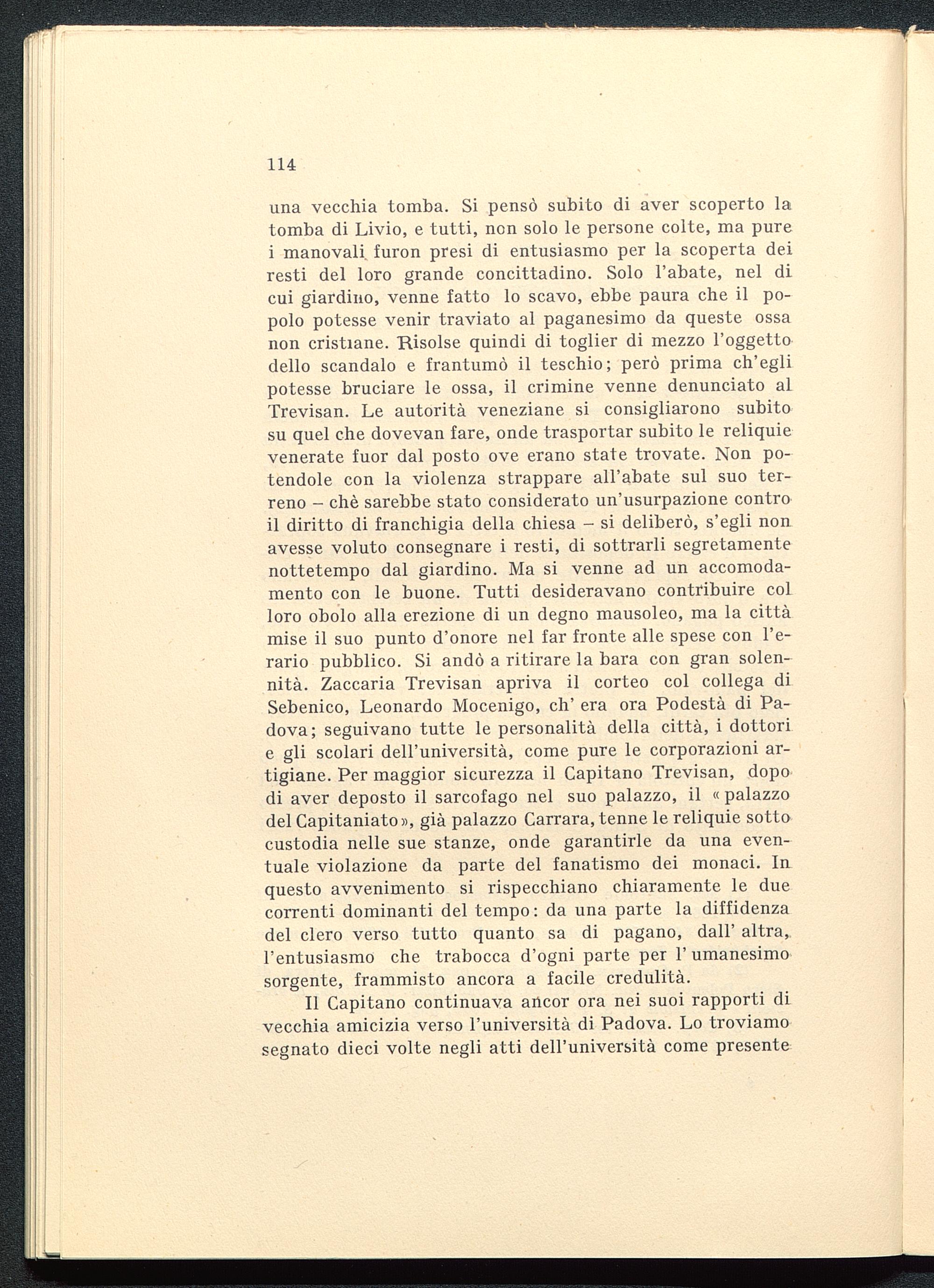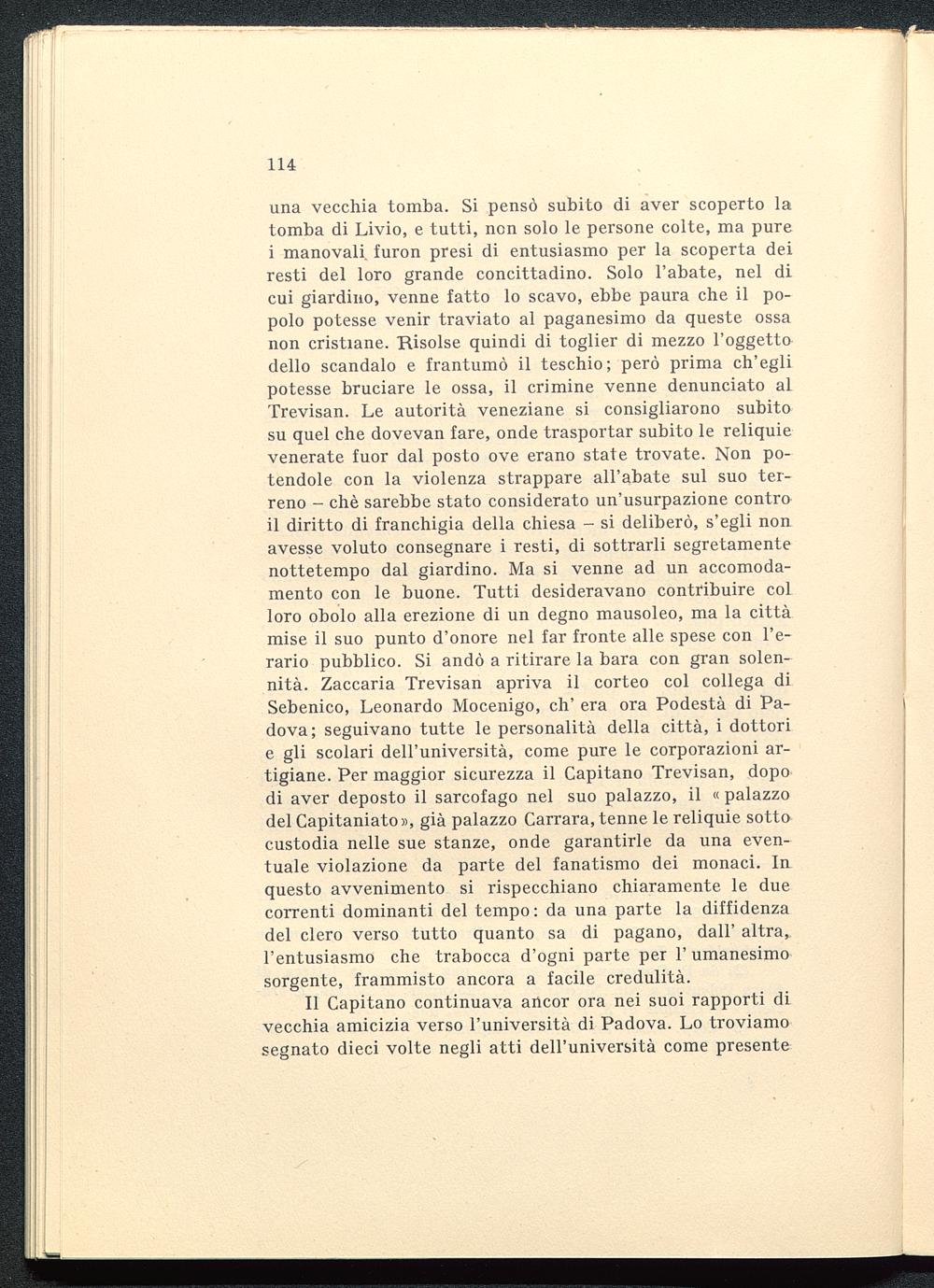 una vecchia tomba. Si pensò subito di aver scoperto latomba di Livio, e tutti, non solo le persone colte, ma purei manovali furon presi di entusiasmo per la scoperta deiresti del loro grande concittadino. Solo l'abate, nel dicui giardino, venne fatto lo scavo, ebbe paura che il po-polo potesse venir traviato al paganesimo da queste ossanon cristiane. Risolse quindi di toglier di mezzo l'oggettodello scandalo e frantumò il teschio; però prima ch'eglipotesse bruciare le ossa, il crimine venne denunciato alTrevisan. Le autorità veneziane si consigliarono subitosu quel che dovevan fare, onde trasportar subito le reliquievenerate fuor dal posto ove erano state trovate. Non po-tendole con la violenza strappare all'abate sul suo ter-reno - chè sarebbe stato considerato un'usurpazione controil diritto di franchigia della chiesa - si deliberò, s'egli nonavesse voluto consegnare i resti, di sottrarli segretamentenottetempo dal giardino. Ma si venne ad un accomoda-mento con le buone. Tutti desideravano contribuire colloro obolo alla erezione di un degno mausoleo, ma la cittàmise il suo punto d'onore nel far fronte alle spese con l'e-rario pubblico. Si andò a ritirare la bara con gran solen-nità. Zaccaria Trevisan apriva il corteo col collega diSebenico, Leonardo Mocenigo, eh' era ora Podestà di Pa-dova ; seguivano tutte le personalità della città, i dottorie gli scolari dell'università, come pure le corporazioni ar-tigiane. Per maggior sicurezza il Capitano Trevisan, dopodi aver deposto il sarcofago nel suo palazzo, il « palazzodel Capitaniato », già palazzo Carrara , tenne le reliquie sottocustodia nelle sue stanze, onde garantirle da una even-tuale violazione da parte del fanatismo dei monaci. Inquesto avvenimento si rispecchiano chiaramente le duecorrenti dominanti del tempo: da una parte la diffidenzadel clero verso tutto quanto sa di pagano, dall' altra,l'entusiasmo che trabocca d'ogni parte per l'umanesimosorgente, frammisto ancora a facile credulità.