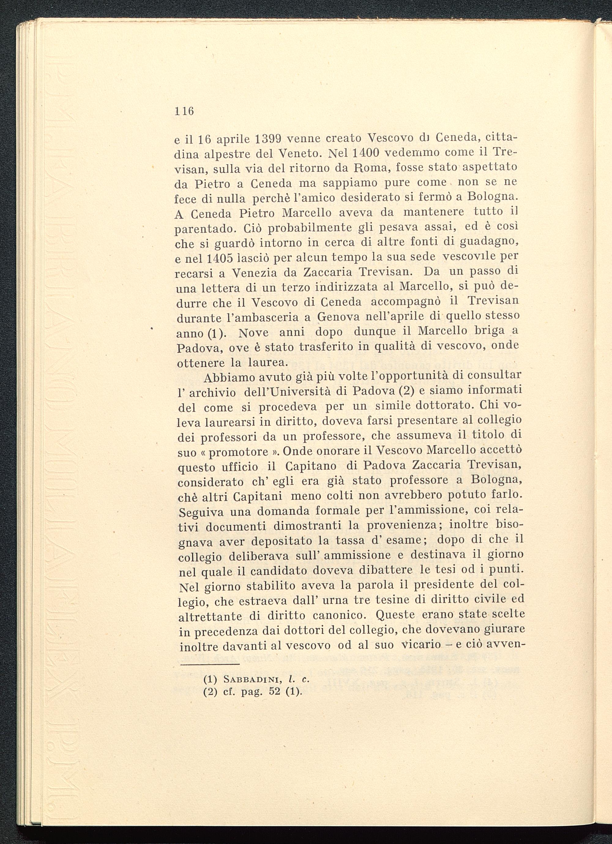 e il 16 aprile 1399 venne creato Vescovo dj Ceneda, citta-dina alpestre del Veneto . Nel 1400 vedemmo come il Tre-visan, sulla via del ritorno da Roma , fosse stato aspettatoda Pietro a Ceneda ma sappiamo pure come non se nefece di nulla perchè l'amico desiderato si fermò a Bologna .A Ceneda Pietro Marcello aveva da mantenere tutto ilparentado. Ciò probabilmente gli pesava assai, ed è cosiche si guardò intorno in cerca di altre fonti di guadagno,e nel 1405 lasciò per alcun tempo la sua sede vescovile perrecarsi a Venezia da Zaccaria Trevisan. Da un passo diuna lettera di un terzo indirizzata al Marcello, si può de-durre che il Vescovo di Ceneda accompagnò il Trevisandurante l'ambasceria a Genova nell'aprile di quello stessoanno(l). Nove anni dopo dunque il Marcello briga aPadova , ove è stato trasferito in qualità di vescovo, ondeottenere la laurea.