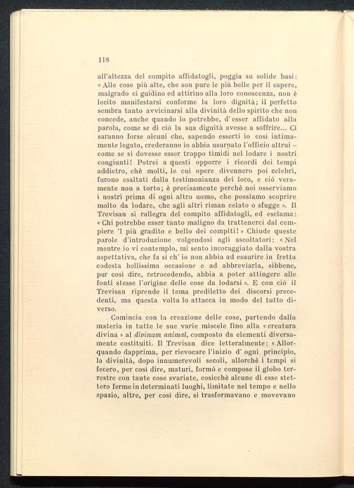 Comincia con la creazione delle cose, partendo dallamateria in tutte le sue varie miscele fino alla « creaturadivina » al divinimi animai, composto da elementi diversa-mente costituiti. Il Trevisan dice letteralmente: «Allor-quando dapprima, per rievocare l'inizio d' ogni principio,la divinità, dopo innumerevoli secoli, allorché i tempi sifecero, per così dire, maturi, formò e compose il globo ter-restre con tante cose svariate, cosicché alcune di esse stet-tero ferme in determinati luoghi, limitate nel tempo e nellospazio, altre, per così dire, si trasformavano e movevano