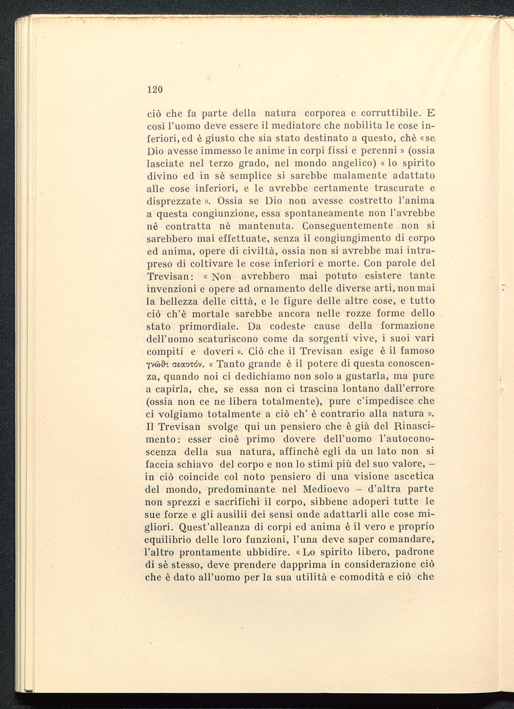 ciò che fa parte della natura corporea e corruttibile. Ecosì l'uomo deve essere il mediatore che nobilita le cose in-feriori, ed è giusto che sia stato destinato a questo, chè «seDio avesse immesso le anime in corpi fissi e perenni » (ossialasciate nel terzo grado, nel mondo angelico) « lo spiritodivino ed in sè semplice si sarebbe malamente adattatoalle cose inferiori, e le avrebbe certamente trascurate edisprezzate ». Ossia se Dio non avesse costretto l'animaa questa congiunzione, essa spontaneamente non l'avrebbenè contratta nè mantenuta. Conseguentemente non sisarebbero mai effettuate, senza il congiungimento di corpoed anima, opere di civiltà, ossia non si avrebbe mai intra-preso di coltivare le cose inferiori e morte. Con parole delTrevisan: « Non avrebbero mai potuto esistere tanteinvenzioni e opere ad ornamento delle diverse arti, non maila bellezza delle città, e le figure delle altre cose, e tuttociò ch'è mortale sarebbe ancora nelle rozze forme dellostato primordiale. Da codeste cause della formazionedell'uomo scaturiscono come da sorgenti vive, i suoi varicompiti e doveri ». Ciò che il Trevisan esige è il famoso•yvwih gsocotóv. « Tanto grande è il potere di questa conoscen-za, quando noi ci dedichiamo non solo a gustarla, ma purea capirla, che, se essa non ci trascina lontano dall'errore(ossia non ce ne libera totalmente), pure c'impedisce checi volgiamo totalmente a ciò eh' è contrario alla natura ».Il Trevisan svolge qui un pensiero che è già del Rinasci-mento: esser cioè primo dovere dell'uomo l'autocono-scenza della sua natura, affinchè egli da un lato non sifaccia schiavo del corpo e non lo stimi più del suo valore, -in ciò coincide col noto pensiero di una visione asceticadel mondo, predominante nel Medioevo - d'altra partenon sprezzi e sacrifichi il corpo, sibbene adoperi tutte lesue forze e gli ausilii dei sensi onde adattarli alle cose mi-gliori. Quest'alleanza di corpi ed anima è il vero e proprioequilibrio delle loro funzioni, l'una deve saper comandare,l'altro prontamente ubbidire. « Lo spirito libero, padronedi sè stesso, deve prendere dapprima in considerazione ciòche è dato all'uomo per la sua utilità e comodità e ciò che