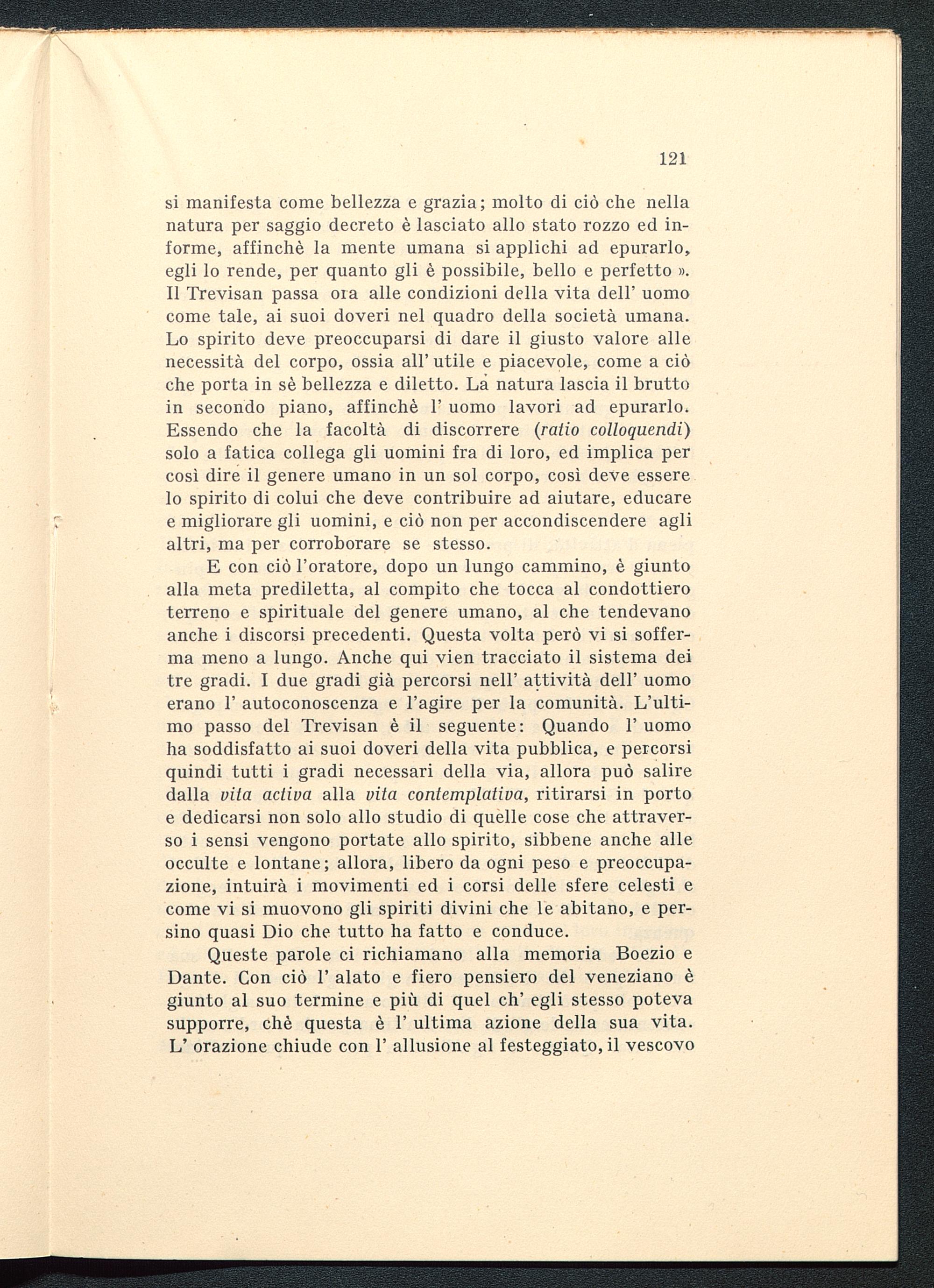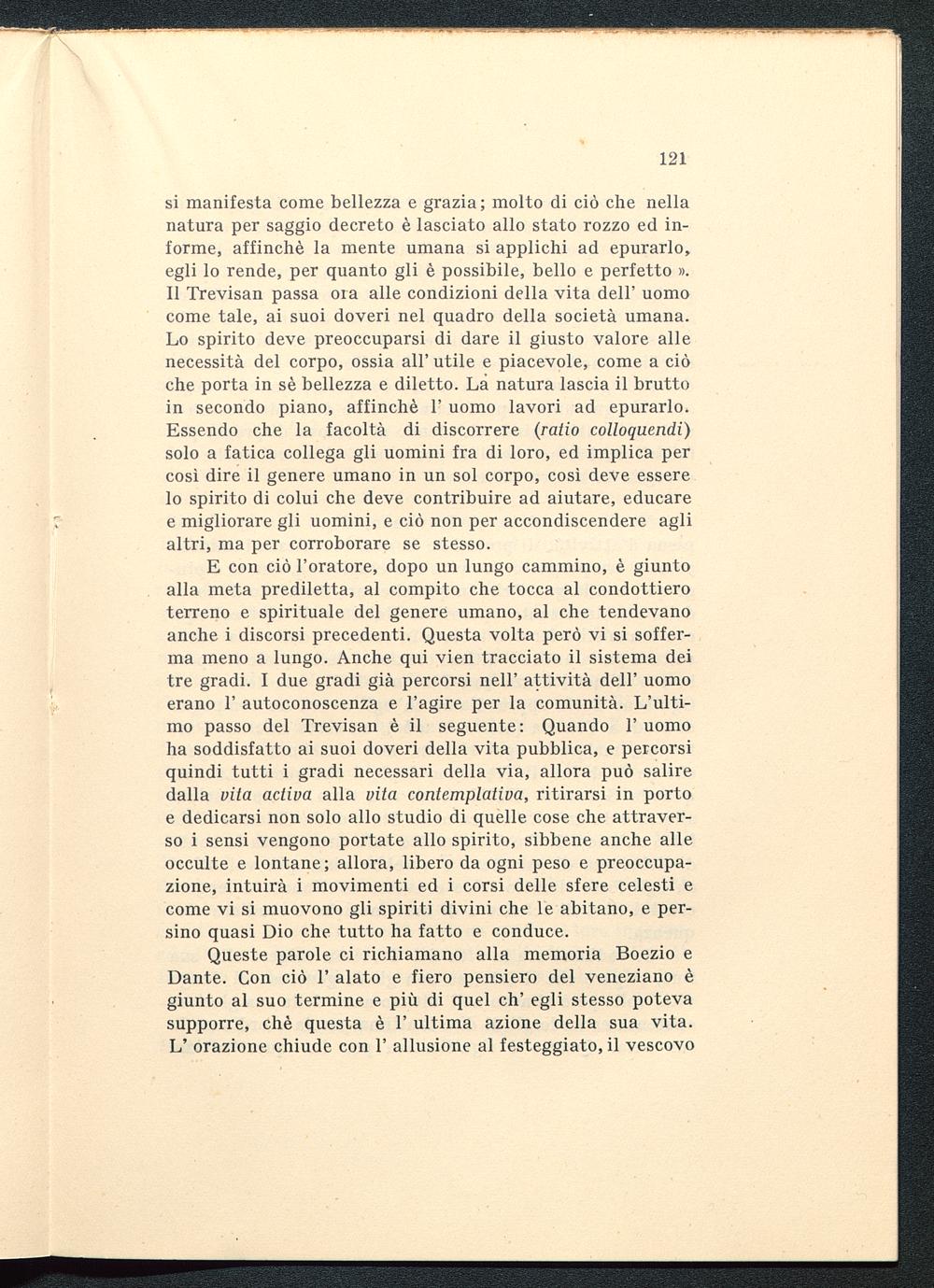 Queste parole ci richiamano alla memoria Boezio eDante . Con ciò 1' alato e fiero pensiero del veneziano ègiunto al suo termine e più di quel eh' egli stesso potevasupporre, chè questa è 1' ultima azione della sua vita.L' orazione chiude con 1' allusione al festeggiato, il vescovo