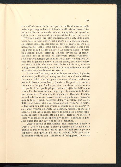 E con ciò l'oratore, dopo un lungo cammino, è giuntoalla meta prediletta, al compito che tocca al condottieroterreno e spirituale del genere umano, al che tendevanoanche i discorsi precedenti. Questa volta però vi si soffer-ma meno a lungo. Anche qui vien tracciato il sistema deitre gradi. I due gradi già percorsi nell' attività dell' uomoerano 1' autoconoscenza e l'agire per la comunità. L'ulti-mo passo del Trevisan è il seguente: Quando 1' uomoha soddisfatto ai suoi doveri della vita pubblica, e percorsiquindi tutti i gradi necessari della via, allora può saliredalla vita adiva alla vita contemplativa, ritirarsi in portoe dedicarsi non solo allo studio di quelle cose che attraver-so i sensi vengono portate allo spirito, sibbene anche alleocculte e lontane; allora, libero da ogni peso e preoccupa-zione, intuirà i movimenti ed i corsi delle sfere celesti ecome vi si muovono gli spiriti divini che le abitano, e per-sino quasi Dio che tutto ha fatto e conduce.