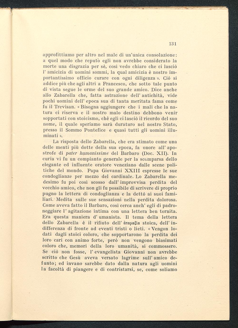 La risposta dello Zabarella, che era stimato come unadelle menti più dotte della sua epoca, fa onore all' apo-strofe di pater humanissime del Barbaro (Doc. XII). Incuria vi fu un compianto generale per la scomparsa delloelegante ed influente oratore veneziano dalle scene poli-tiche del mondo. Papa Giovanni XXIII espresse le suecondoglianze per mezzo del cardinale. Lo Zabarella me-desimo fu poi così scosso dall' improvvisa perdita delvecchio amico, che non gli fu possibile di scrivere di propriopugno la lettera di condoglianza e la dettò ai suoi fami-liari. Medita sulle sue sensazioni nella perdita dolorosa.Come aveva fatto il Barbaro, così cerca anch' egli di padro-neggiare 1' agitazione intima con una lettera ben tornita.Era questa maniera d' umanista. Il tema della letteradello Zabarella è il rifiuto dell' àtapa&oc stoica, dell' in-differenza di fronte ad eventi tristi o lieti. « Vengon lo-dati dagli stoici coloro, che sopportarono la perdita deiloro cari con animo forte, però non vengono biasimaticoloro che, memori della loro umanità, si commossero.Se ciò non fosse, 1' evangelista Giovanni non avrebbescritto che Gesù aveva versato lagrime sull' amico de-funto; ed invano sarebbe dato dalla natura agli uominila facoltà di piangere e di contristarsi, se, come soliamo